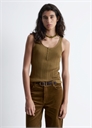 Этот топ тонкой вязки с ребристой фактурой и мягкой отделкой в виде труб. Вырез горловины и спинка дополнены полузастежкой на пуговицах. Длина майки: 55,5 см / 21,8”