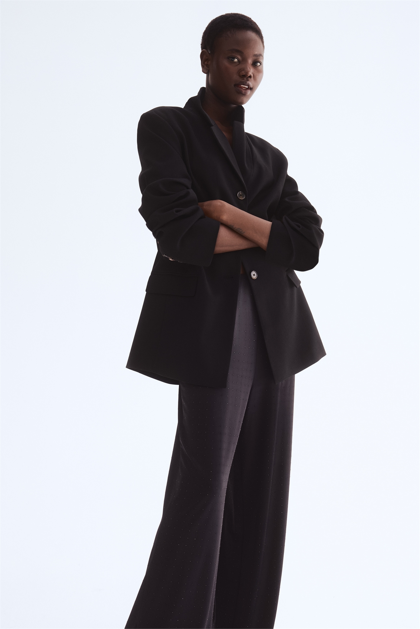 Брюки из джерси, украшенные мелкими стразами, с высокой эластичной талией и прямыми ногами.