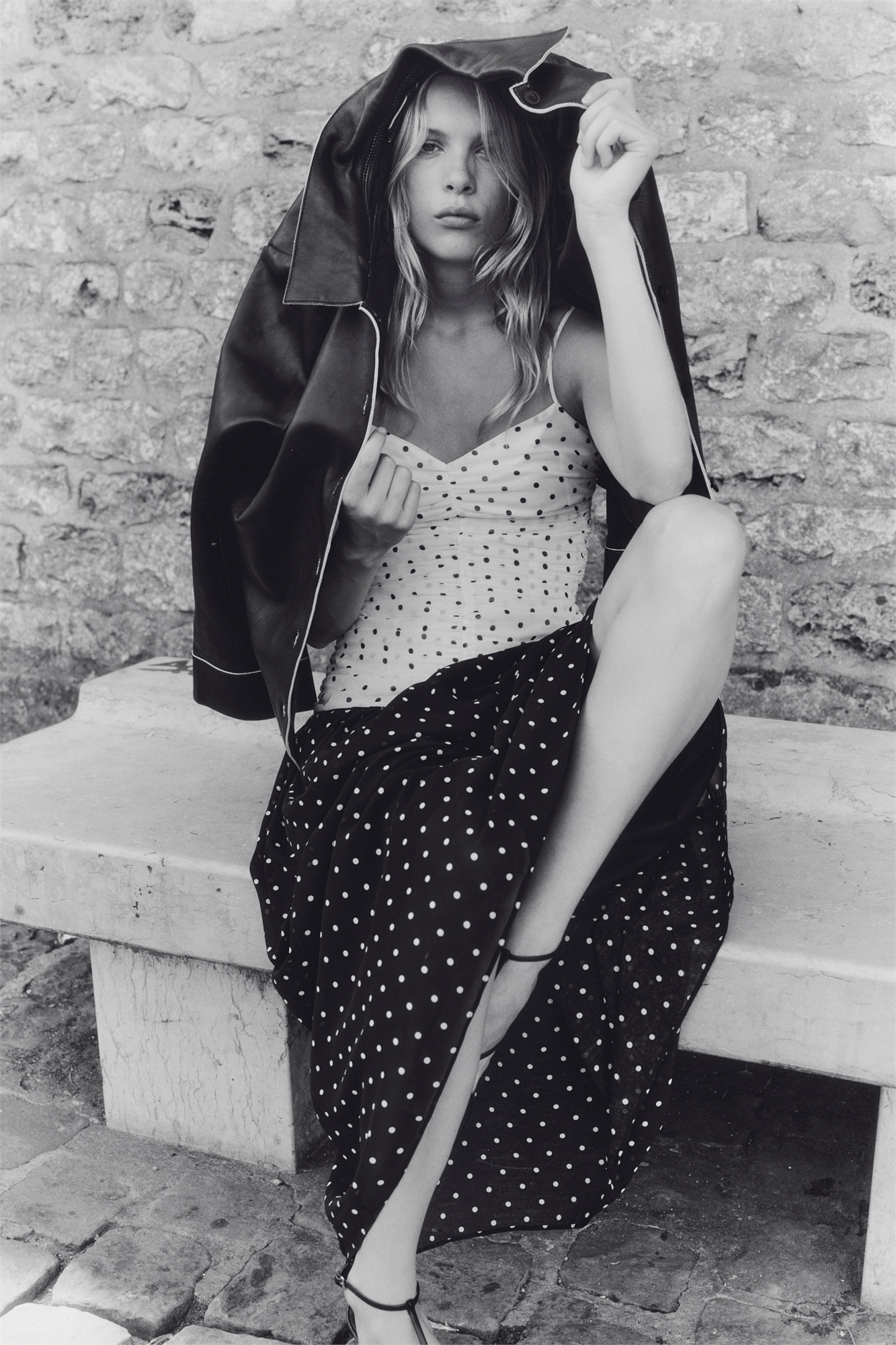 Платье длиной до колен из тканого материала с вырезом в форме сердца и регулируемыми узкими бретелями. Облегающий лиф со сборками по всему периметру и потайной застежкой-молнией сзади. Аккуратная расклешенная юбка. На подкладке.