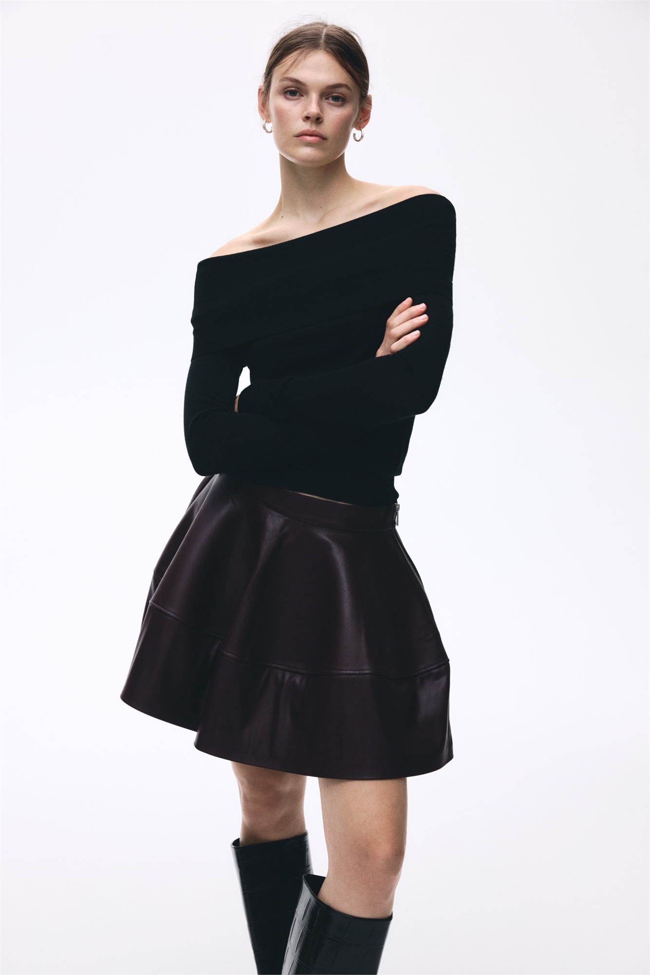 Мини-юбка из мелованной ткани с А-линией силуэта и прямым двухслойным подолом. Высокая талия, застежка на молнию и пуговицу с одной стороны.