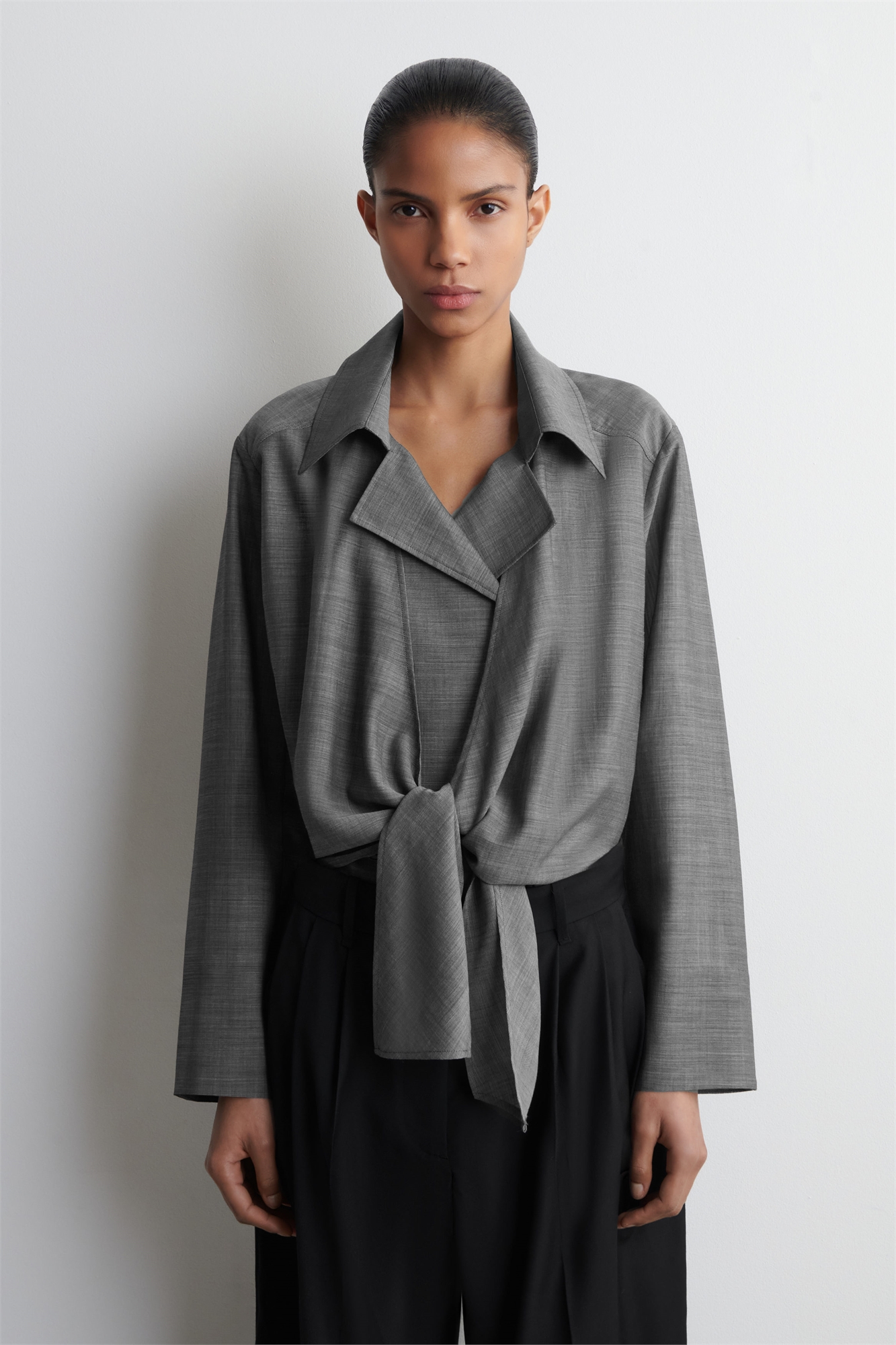 Коллекция COS в этом сезоне вдохновлена модой 80-х годов. Эта рубашка классического серого цвета изготовлена из прозрачной смеси шерсти и рами и имеет открытый воротник и завязку спереди. Свободный кройЗастежка на пуговицахХимчистка Длина спинки размера EU 36 составляет 58,5 см / Модель носит размер EU 36