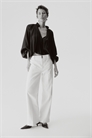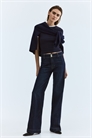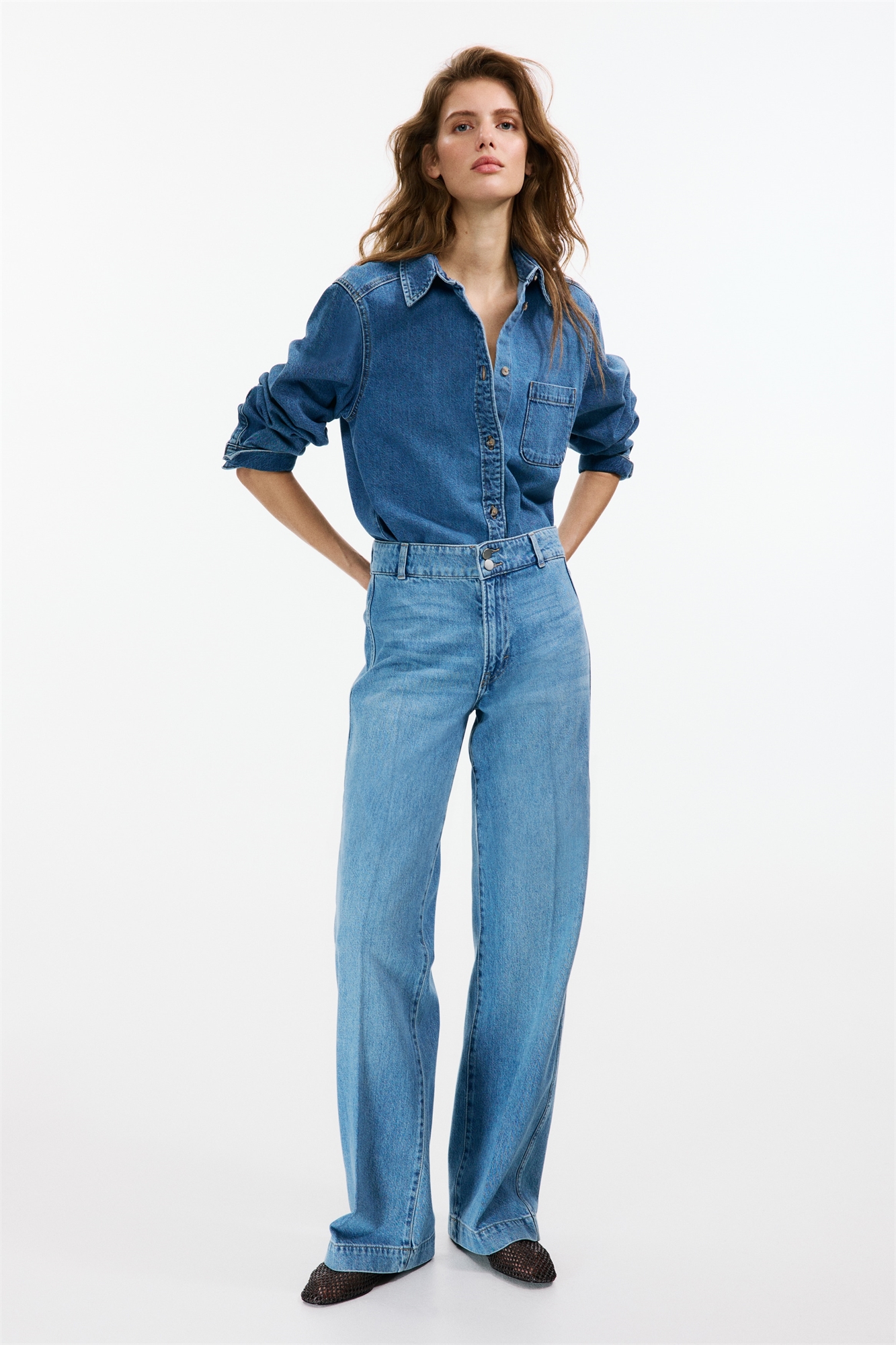 Джинсы из жесткого хлопкового денима, который сначала кажется твердым, но со временем становится мягким и свободным. Широкие брючины с прямым кроем от талии до бедер и широким кроем от бедер до подола. Высокая талия с застежкой-молнией и двумя пуговицами, складки спереди и сзади. Стандартная длина, рассчитанная на то, чтобы джинсы доходили до верхней части стопы, практически не образуя складок.