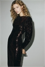 Платье длиной до колен из блестящей сетки с круглым вырезом, велюровыми завязками сзади на шее и открытой спиной с потайной застежкой-молнией на талии. Накладки на плечах, длинные рукава и прямой подол. Подкладка из джерси.
