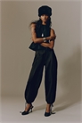Свободные брюки длиной до щиколоток из мятого материала с высокой талией, застежкой на молнию и пуговицу. Небрежные боковые карманы, фальшивые задние карманы и бочкообразные ноги со складками спереди. Эластичная отделка и узкий шнурок на подоле.