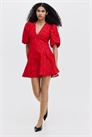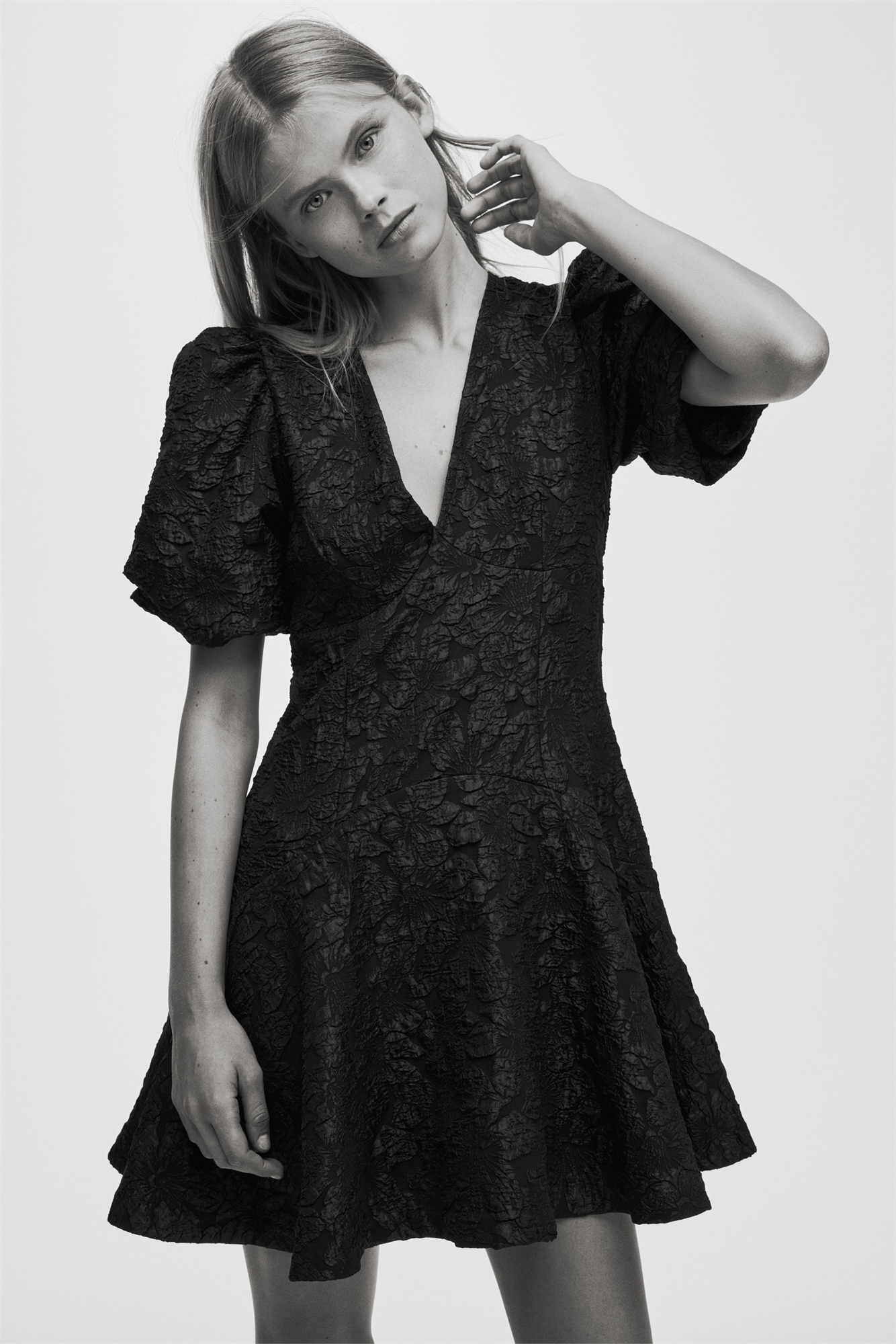 Короткое платье из жаккардового переплетения с V-образным вырезом горловины и потайной застежкой на молнию и крючок-глазок сзади. Короткие пышные рукава, формирующие швы на талии для создания четкого силуэта и расклешенная юбка. Частично на подкладке.