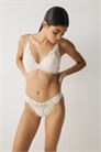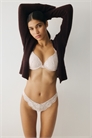 Трусы-стринги из кружева с заниженной V-образной талией и ластовицей. Обрезные края по проймам ног.