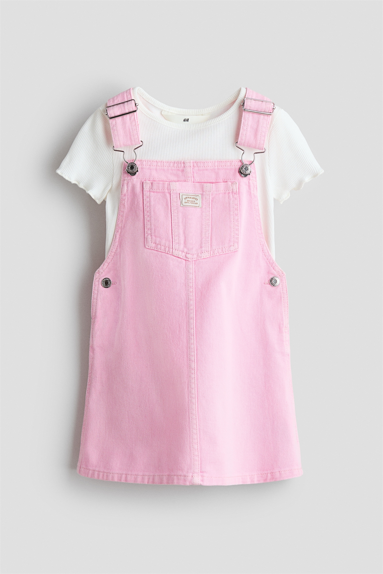 Комплект из платья-сарафана из хлопчатобумажной саржи и футболки из мягкого хлопчатобумажного джерси с ребристой текстурой. Платье-сарафан с регулируемыми бретелями с металлическими застежками, накладным карманом на груди, кнопками по бокам и открытыми задними карманами. Футболка с узкой окантовкой вокруг выреза и оверлочными краями на манжетах и подоле.