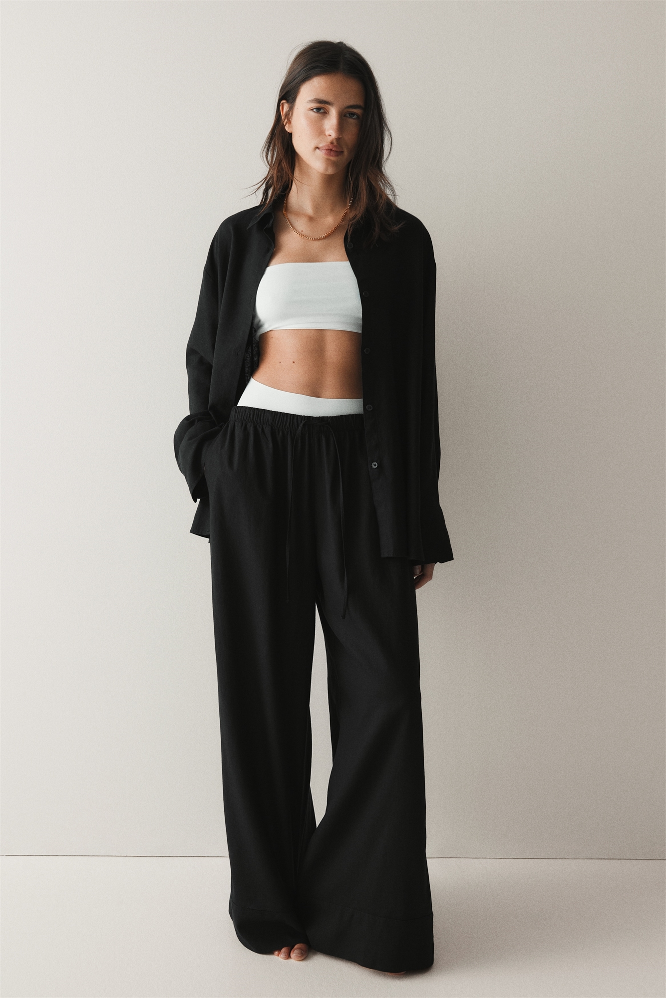 Брюки свободного кроя из легкой ткани, изготовленной из смеси льна и вискозы. Имеют эластичный пояс на шнурке, незаметные боковые карманы и широкие брючины.