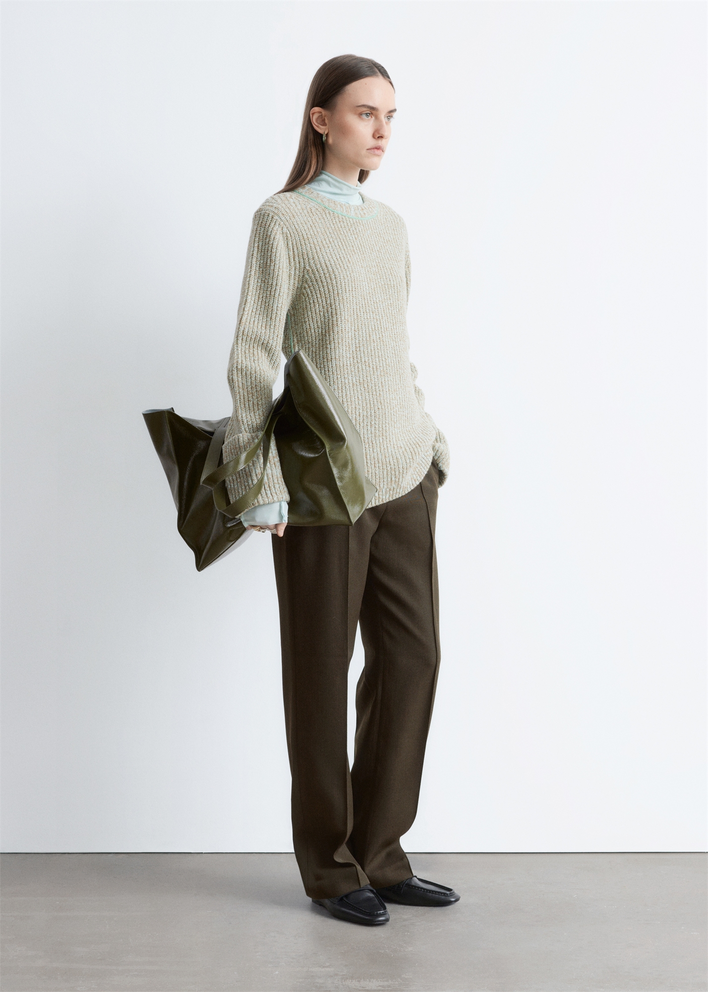 Этот шерстяной свитер с длинными рукавами украшен контрастными декоративными швами. Он имеет широкие ребристые манжеты и ребристые отвороты на вырезе и по низу. Длина свитера: 65 см (размер S)