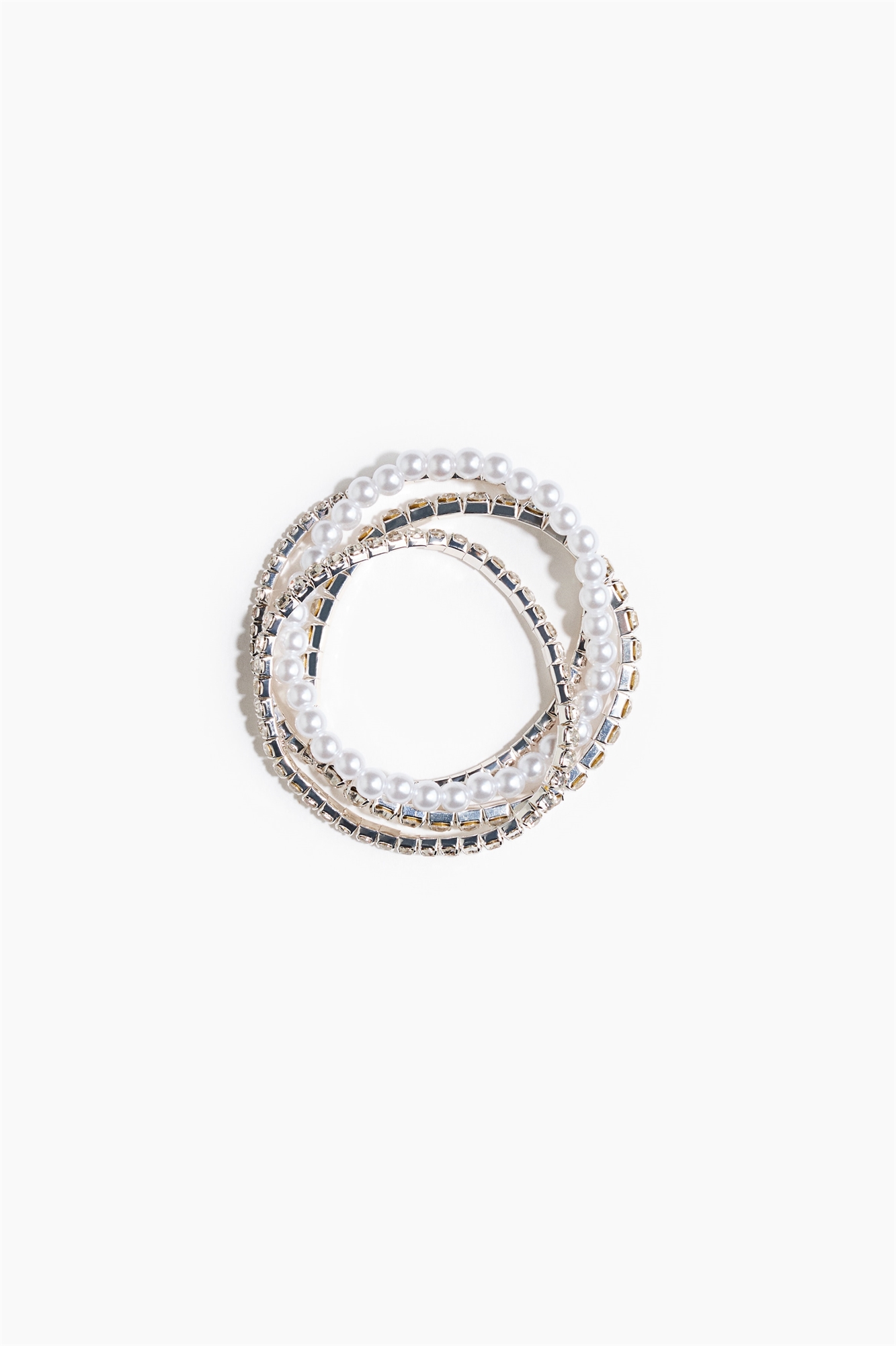 Браслеты разного дизайна, три из которых украшены сверкающими стеклянными стразами, а один - жемчужными бусинами. Носите их по отдельности или складывайте друг на друга, чтобы получить забавный штрих.