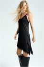 Короткое приталенное платье из мягкого трикотажа интерлок с нежной кружевной отделкой в верхней части и на подоле. V-образный вырез, бретели-спагетти, диагональная кружевная вставка под бюстом и асимметричный подол.