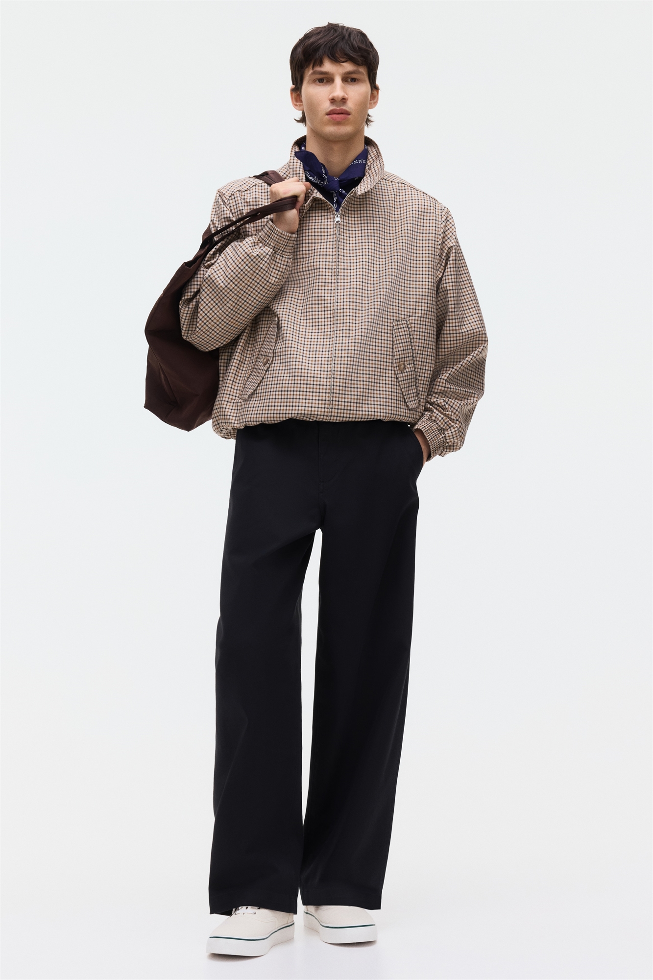 Чиносы из хлопчатобумажной ткани с застежкой-молнией и пуговицей, диагональными боковыми карманами и прорезными задними карманами. Свободный крой, создающий объемный, но не слишком широкий силуэт.
