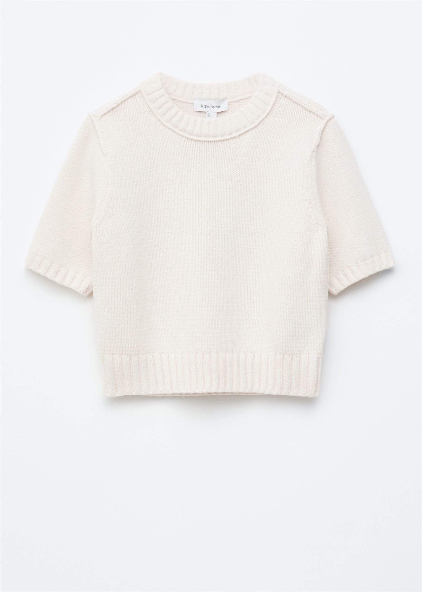 Эта трикотажная футболка короткого облегающего силуэта сшита из шерстяно-хлопковой смеси с ребристой отделкой по вырезу горловины, манжетам и подолу. Для придания образу структурированности она украшена деталями в виде швов. Длина футболки: 50 см / 19,7” (размер S).