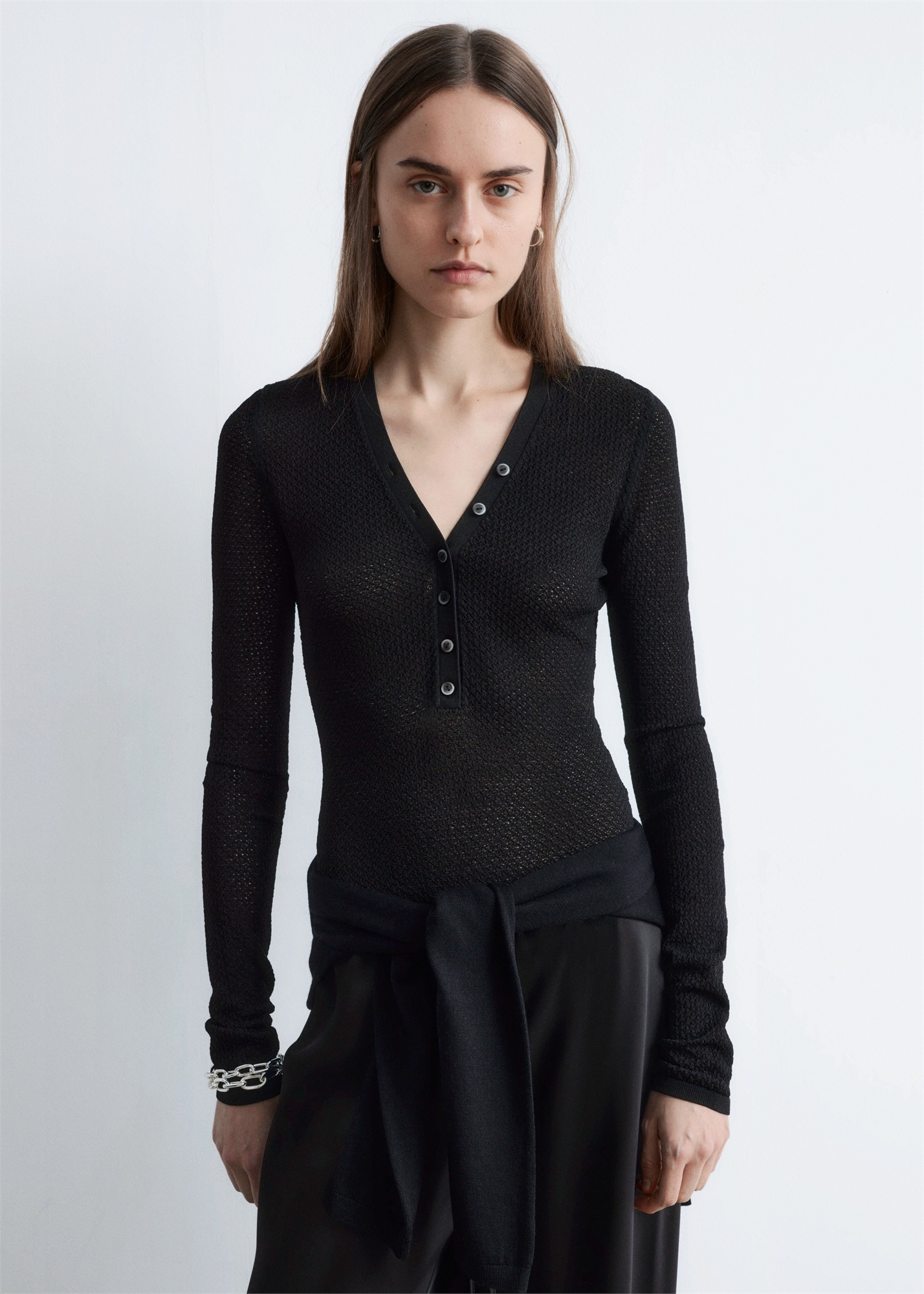 Нежный трикотаж пуатель сочетается с облегающим силуэтом. Этот боди имеет V-образный вырез, полузакрытую застежку на пуговицах и длинные рукава с ребристыми манжетами. Шпильки на ластовице завершают дизайн.