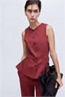 Жилет из тканого материала с V-образным вырезом и пуговицами спереди. Формирующие швы на талии и расклешенный пеплум для приталенного силуэта. На подкладке.