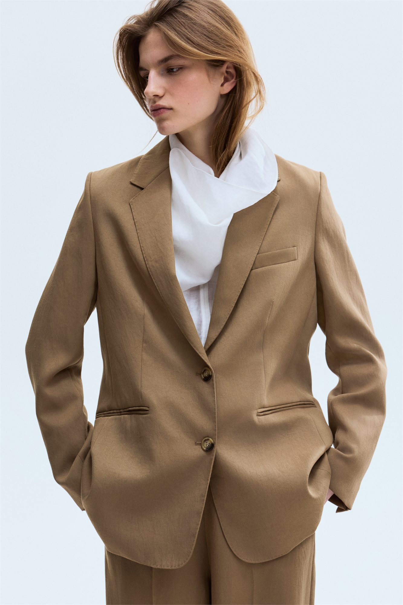 Однобортный блейзер из твила с отложными лацканами, накладным карманом на груди и карманами с отворотами спереди. Плечевые накладки, пуговицы на манжетах и один разрез сзади. Частично на подкладке.