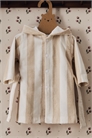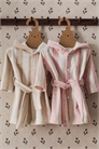 Халат из мягкой хлопковой махровой ткани с полосатым узором. С капюшоном, застежкой на кнопках спереди и поясом на талии.