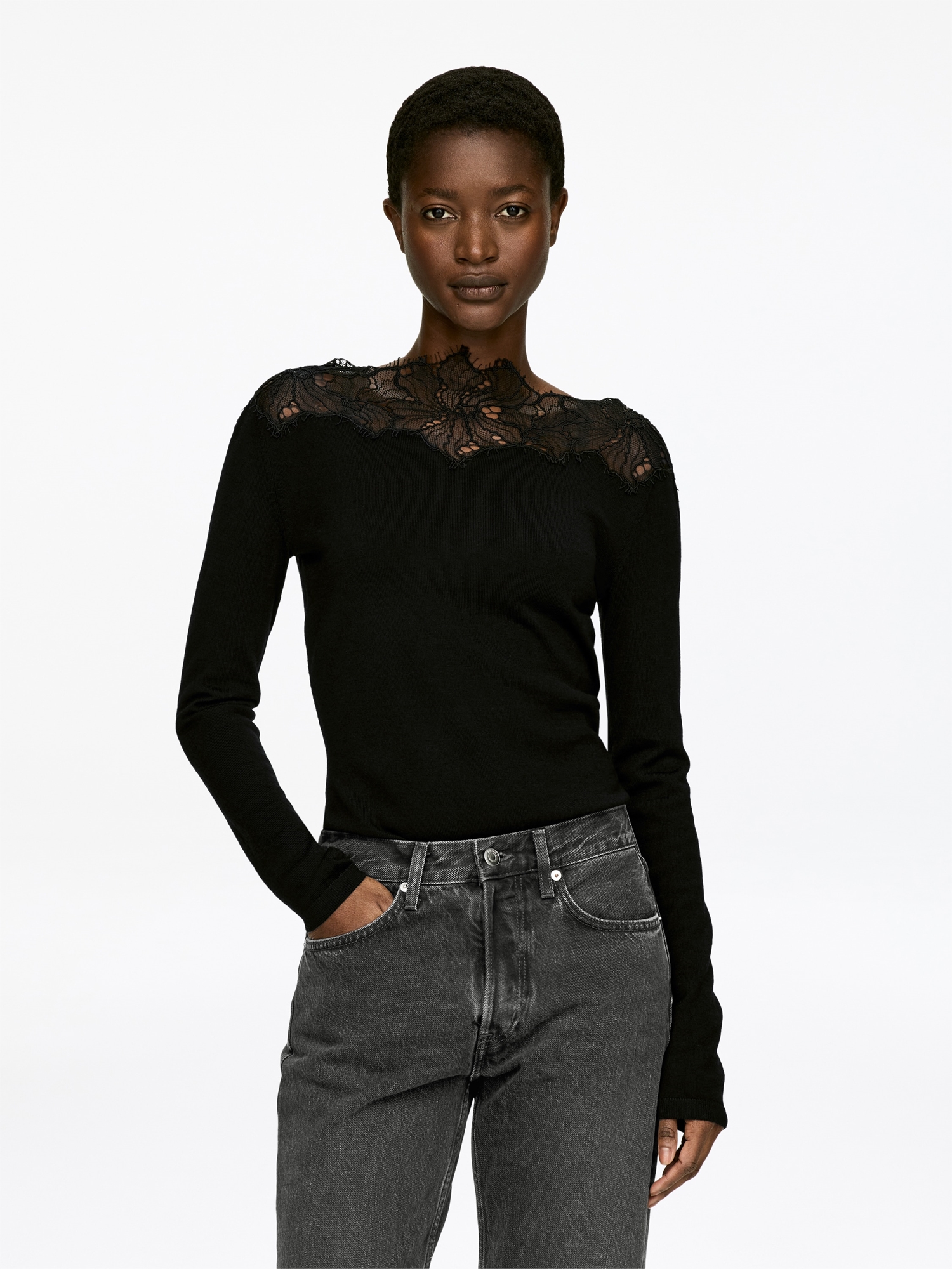Топ с длинными рукавами, вязаный из чистой шерсти. Облегающий крой с нежными кружевными деталями и ребристой отделкой.