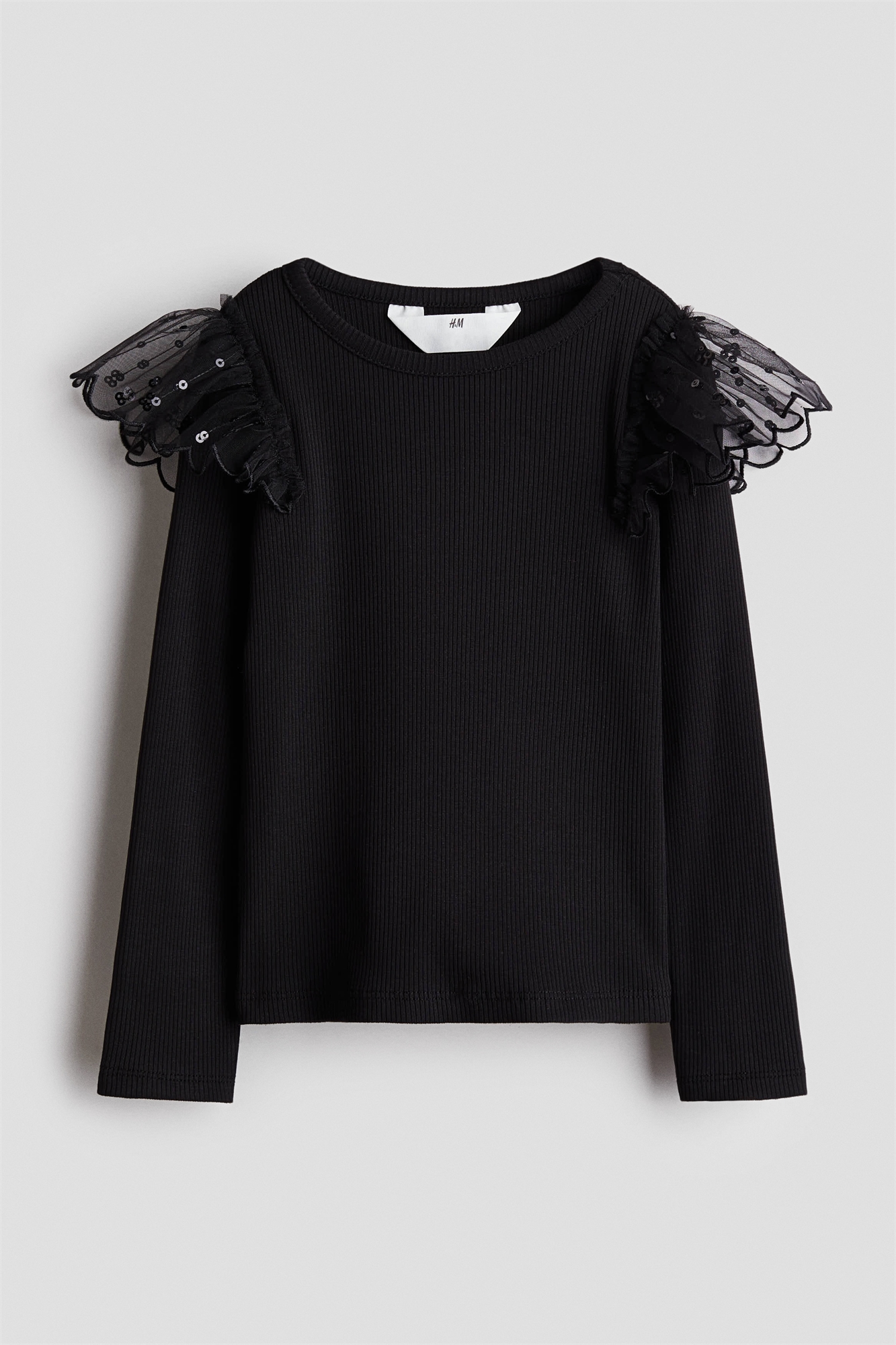 Топ из ребристого трикотажа с блестками и гребешковыми оборками из тюля на плечах. Круглый вырез и длинные рукава.