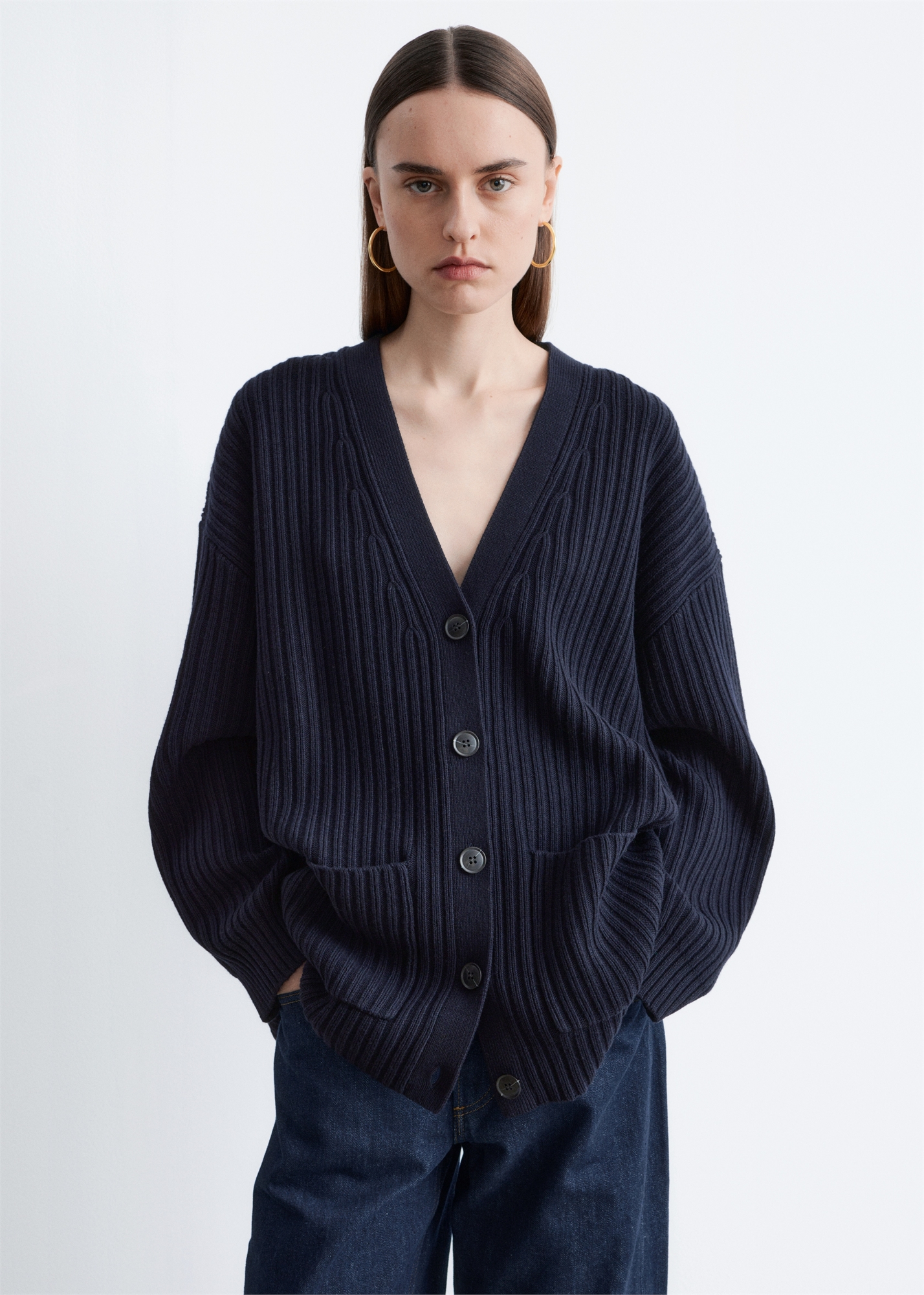 Этот длинный кардиган, связанный из смеси шерсти и хлопка, имеет объемный силуэт с ребристой текстурой, накладные карманы и пуговицы в тон по всей длине спереди.