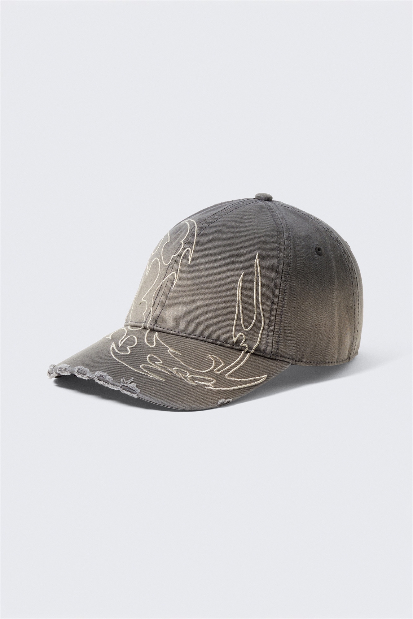 Шестипанельная бейсболка с вышивкой изготовлена из хлопковой саржи. Бейсболка с загнутым краем и деталями дистресса по краям, с поношенной и рваной поверхностью, тональной строчкой, люверсами и регулируемым ремешком на липучке сзади для индивидуальной посадки.