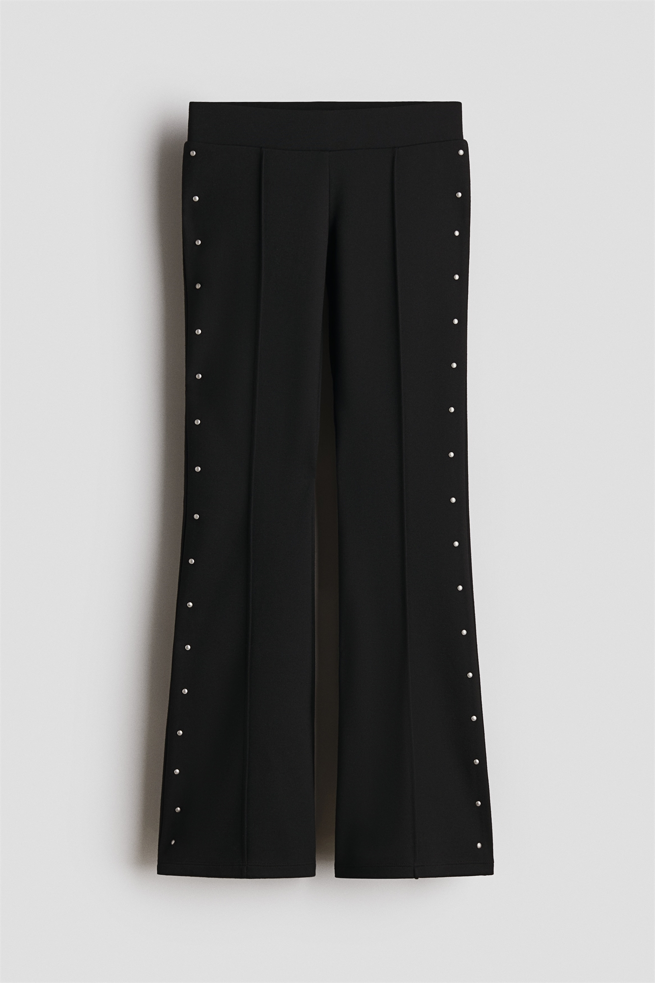 Расклешенные леггинсы из плотного джерси с маленькими металлическими шипами и вшитыми складками по ногам. Эластичная резинка на талии и декоративные карманы сзади.