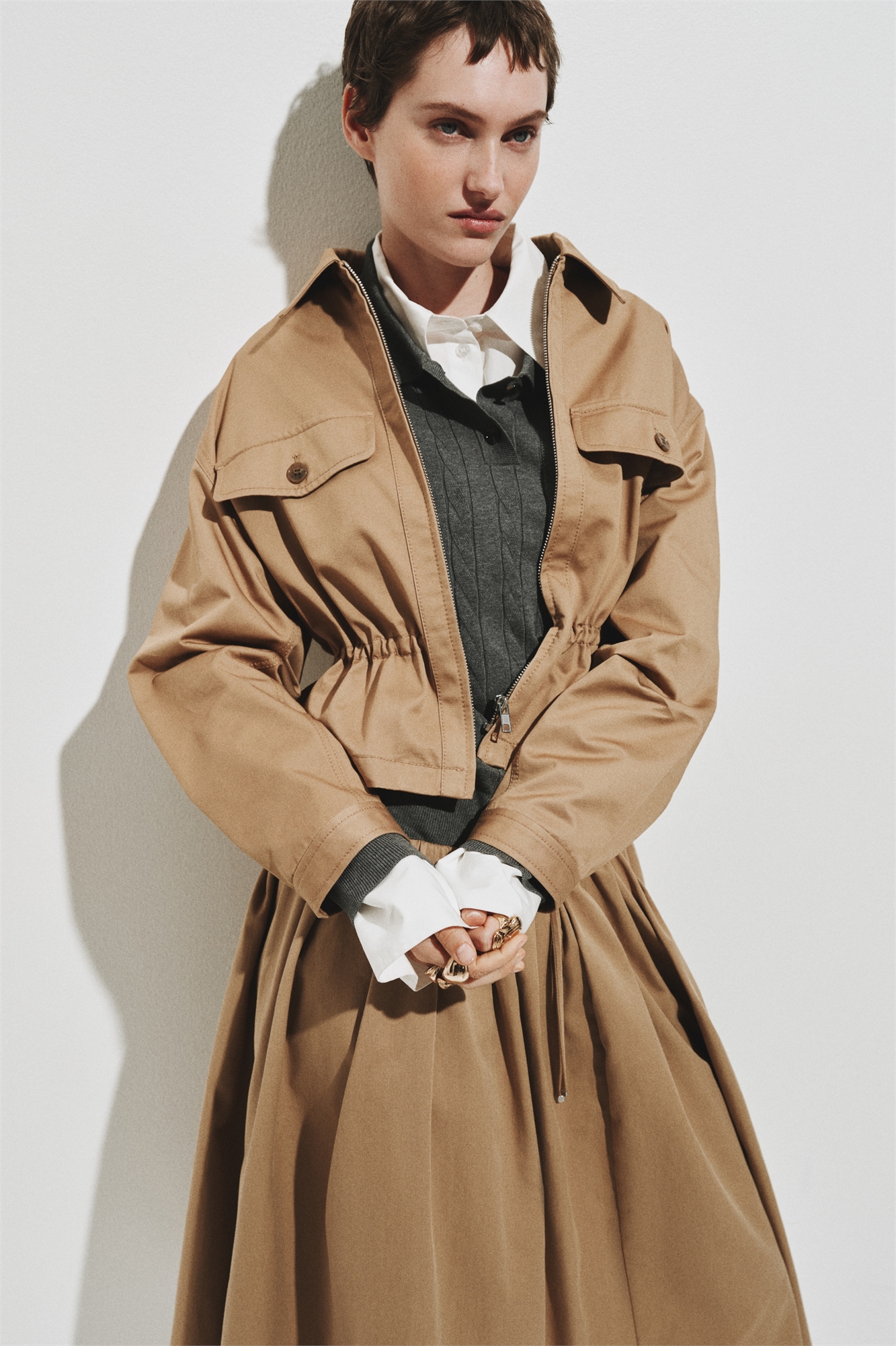 Куртка из хлопчатобумажной саржи с воротником, потайной застежкой-молнией спереди и имитацией нагрудных карманов с клапаном и пуговицей. Потайная шнуровка с фиксаторами на талии и длинные рукава с разрезом и регулируемой застежкой на манжетах. Без подкладки.
