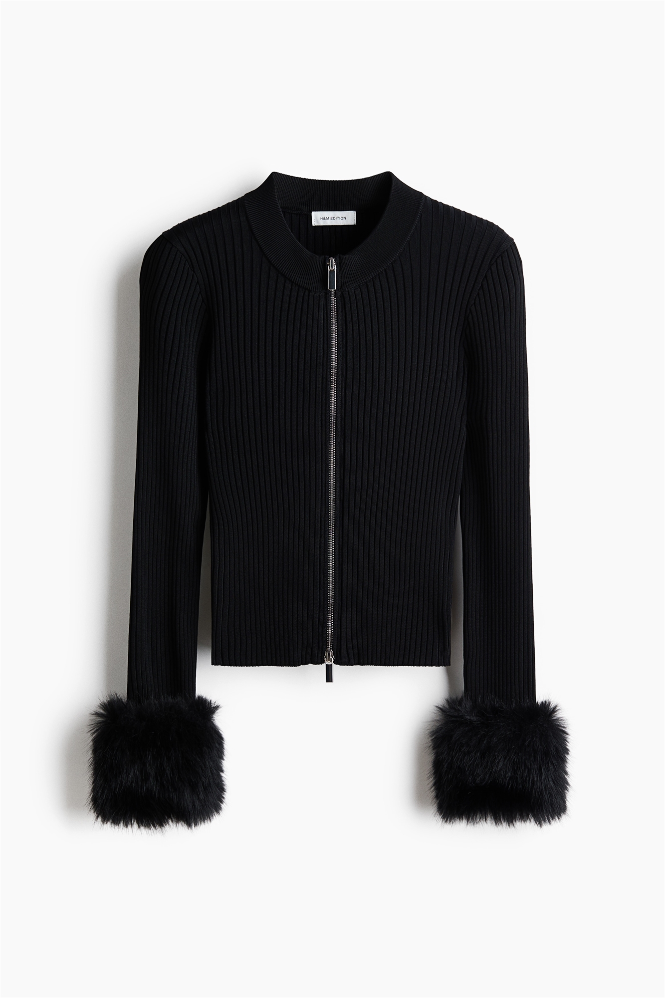 Короткий приталенный кардиган из мягкого трикотажа в рубчик с круглым вырезом, двусторонней застежкой-молнией спереди и каймой из пушистой ткани на манжетах.