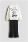Комплект из топа из толстовки с рисунком и мягким начесом внутри и леггинсов из ребристого хлопкового джерси. Топ с круглым вырезом с ребристой отделкой, спущенными плечами и окантовкой манжет и подола. Леггинсы с утяжкой на талии и расклешенным подолом.
