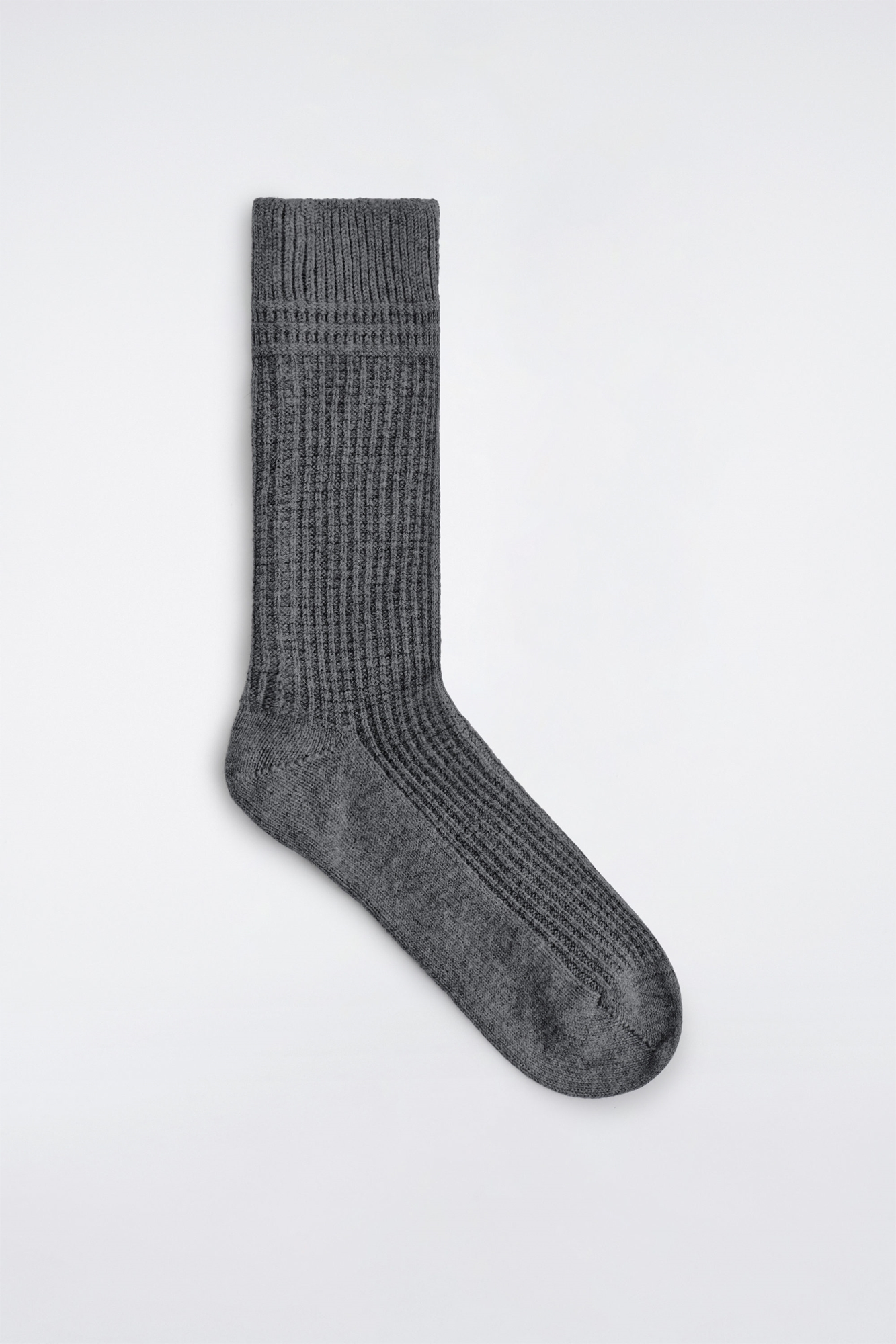 Эти современные носки, выполненные из тактильной вафельной вязки, вяжутся из хлопка и шерсти RWS, которая обладает роскошной мягкостью. Они имеют ребристые манжеты, которые остаются на месте, когда их подтягивают. Этот продукт содержит шерстяное волокно Responsible Wool Standard TE-00047206 (RWS) с ферм, сертифицированных в соответствии с требованиями к благополучию животных и землепользованию Состав: 66% хлопок, 28% шерсть RWS, 5% полиамид (нейлон), 1% эластан. Без учета отделки / Машинная стирка