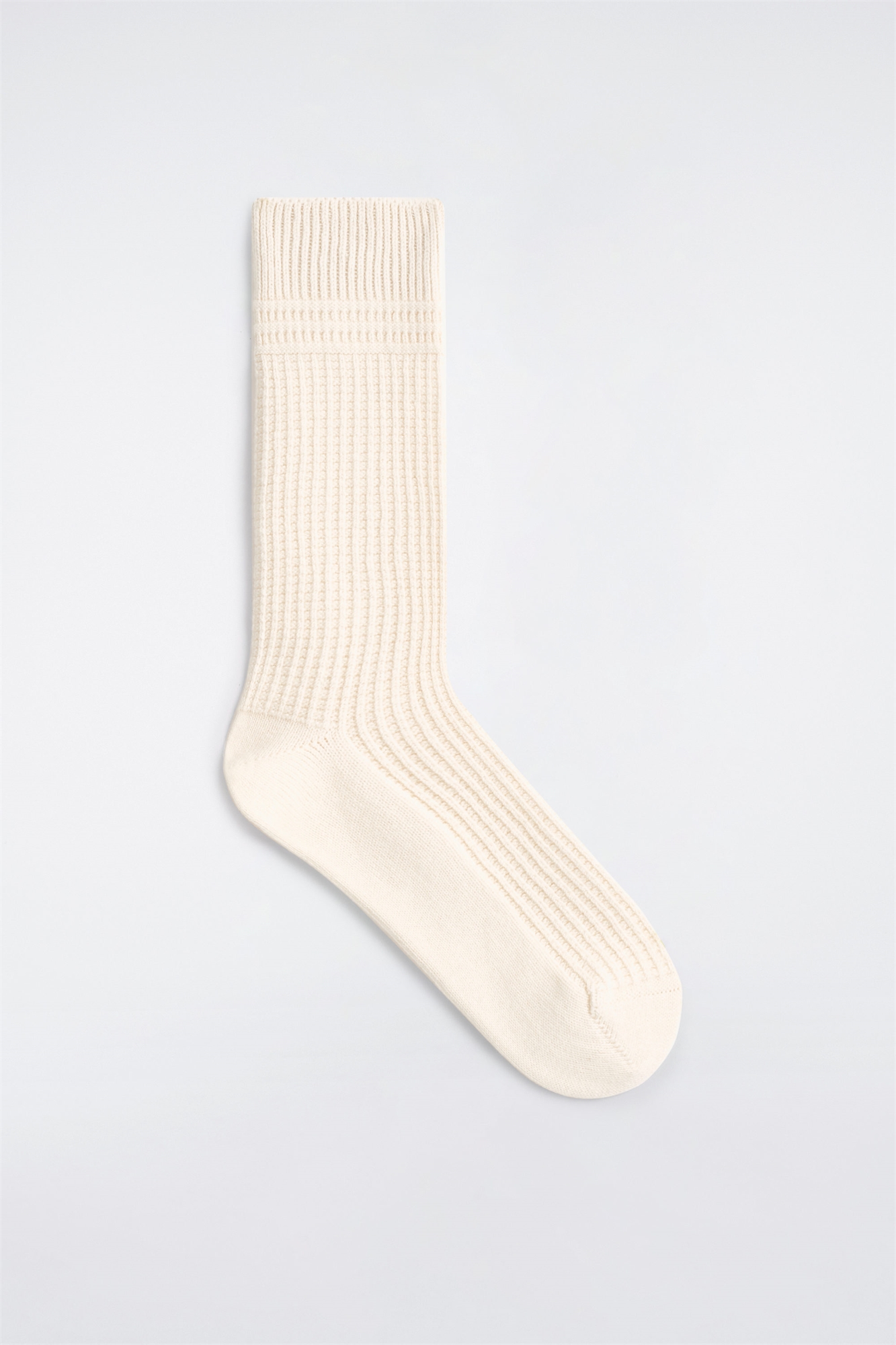 Эти современные носки, выполненные из тактильной вафельной вязки, вяжутся из хлопка и шерсти RWS, которая обладает роскошной мягкостью. Они имеют ребристые манжеты, которые остаются на месте, когда их подтягивают. Этот продукт содержит шерстяное волокно Responsible Wool Standard TE-00047206 (RWS) с ферм, сертифицированных в соответствии с требованиями к благополучию животных и землепользованию Состав: 66% хлопок, 28% шерсть RWS, 5% полиамид (нейлон), 1% эластан. Без учета отделки / Машинная стирка