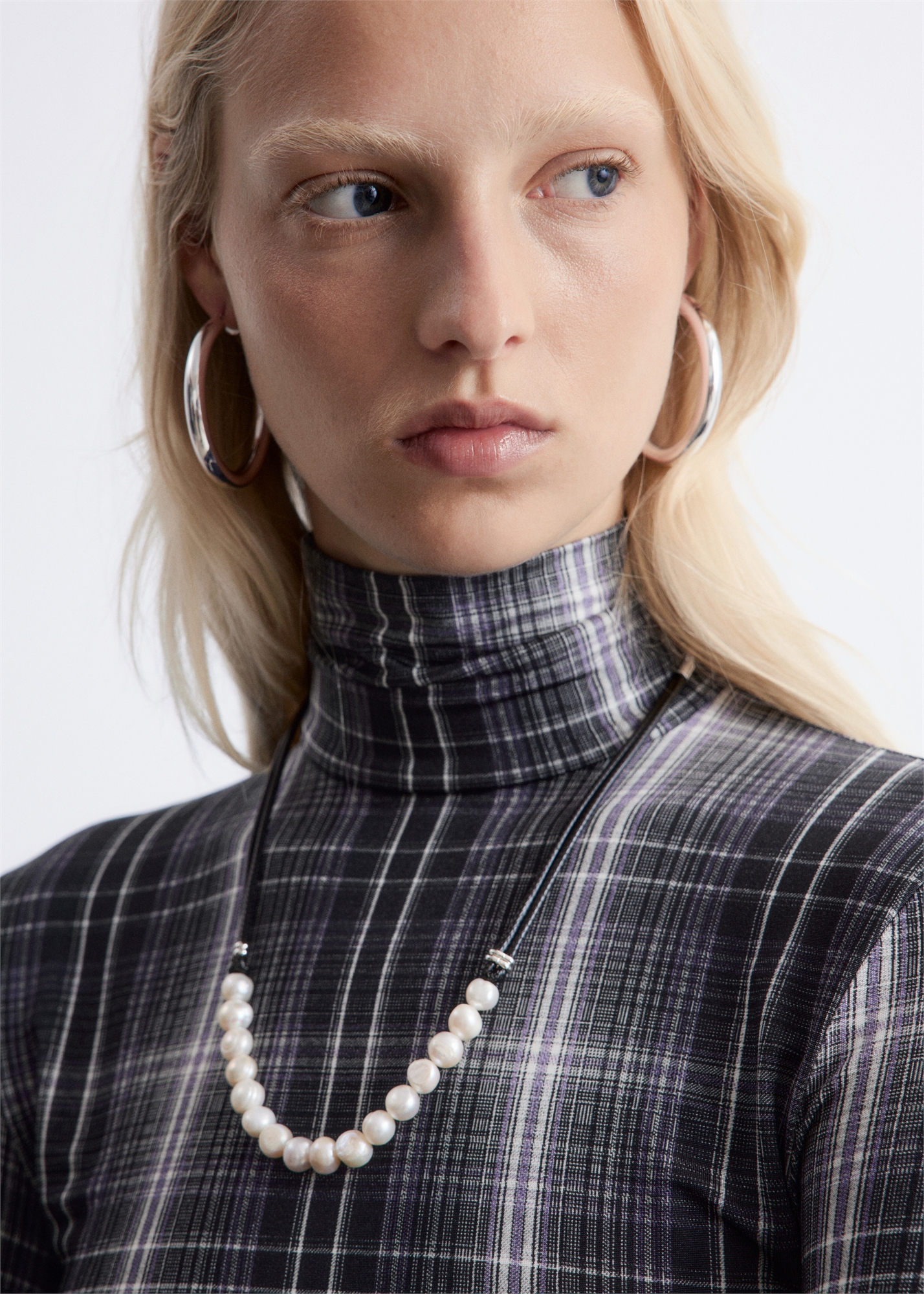 Это ожерелье на шнуре украшено жемчужинами пресной воды неправильной формы, слоистыми секциями и акцентами серебряного тона. Ожерелье оснащено регулируемой бусиной-слайдером для индивидуальной подгонки.