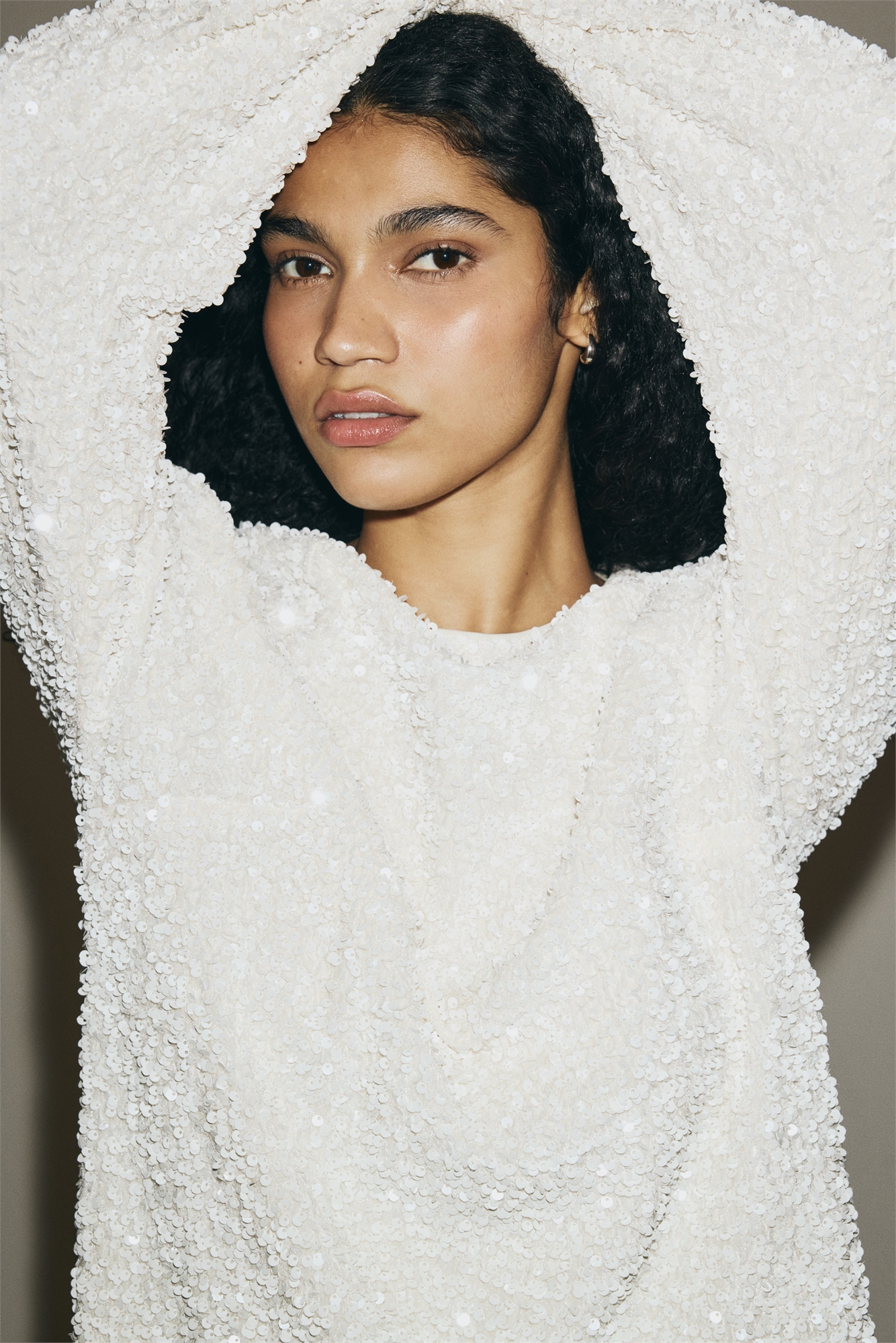 Мини-платье из блестящего велюра с круглым вырезом, потайной застежкой-молнией сзади и длинными рукавами реглан. Подкладка из джерси.