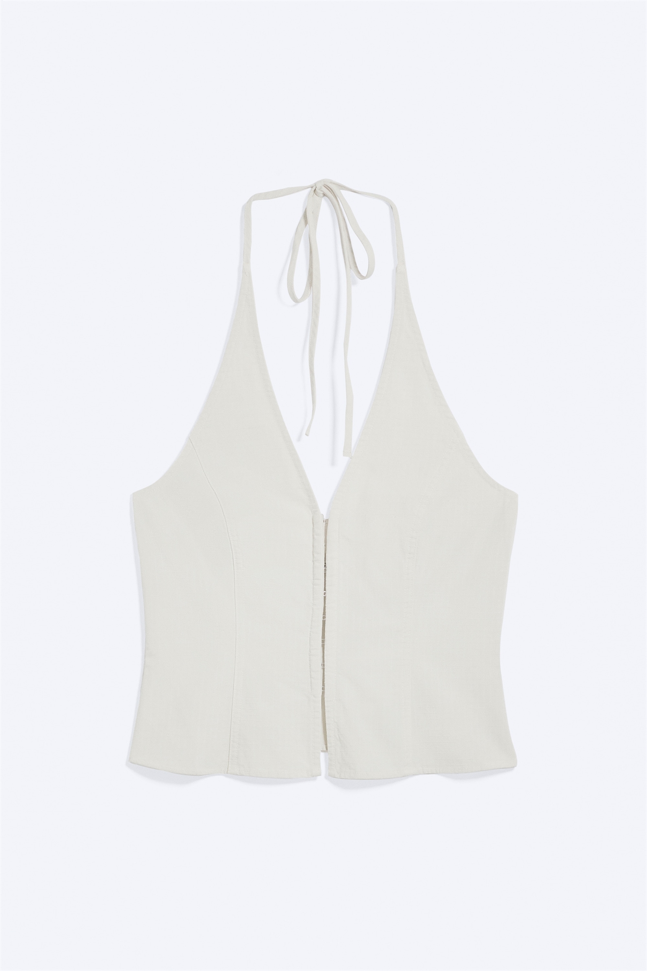 Облегающий топ с завязками за шеей, выполненный из хлопка рипстоп с лаконичным V-образным вырезом. Модель отличается застежкой спереди на крючках и петлях в стиле корсета, а также тонким линией вставок, подчеркивающих фигуру. Завершается регулируемыми завязками на шее.
