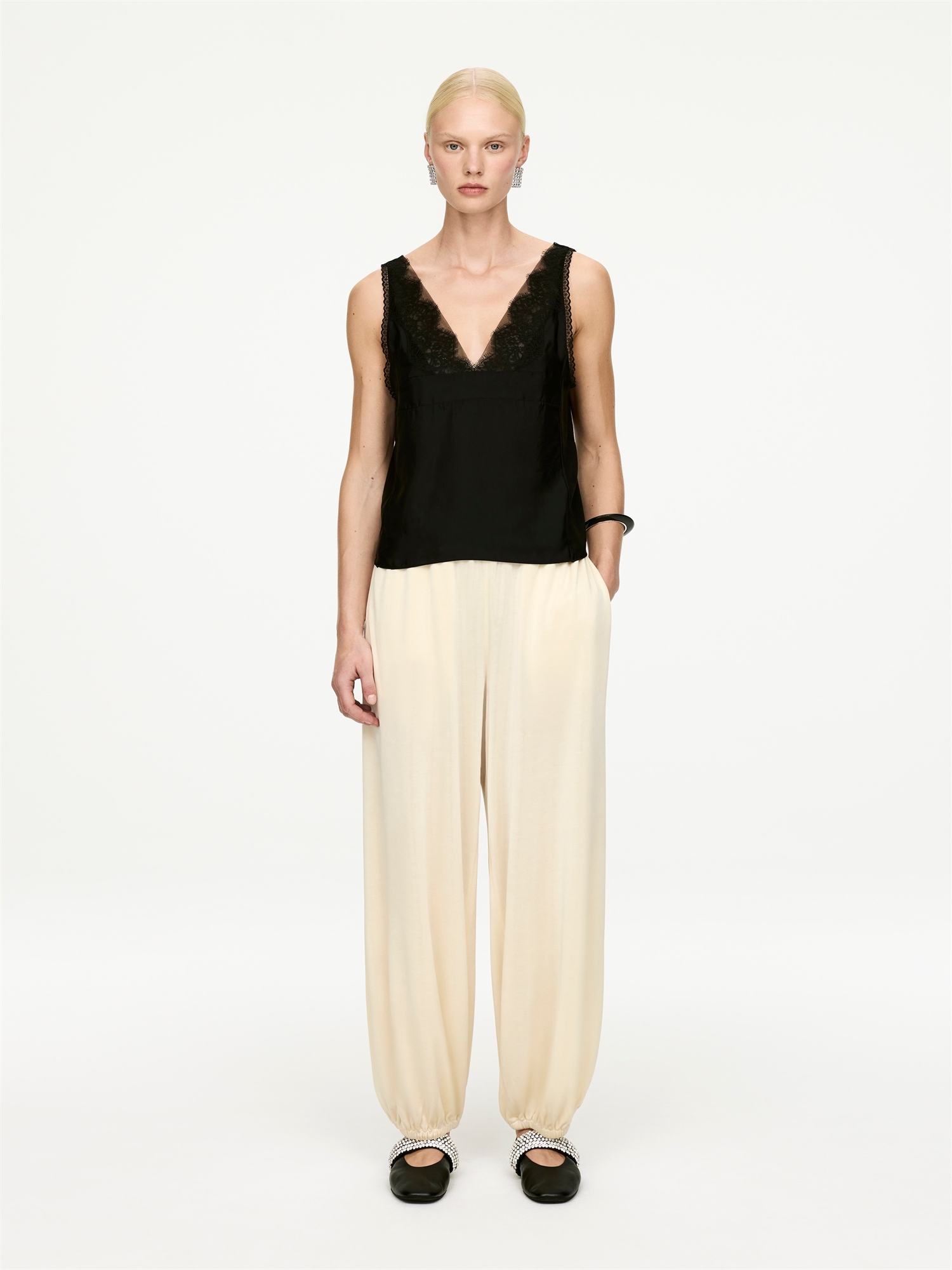 Брюки-баллоны сшиты из эластичной ткани джерси с легким блеском. Модель без подкладки, со сборчатым поясом, эластичными манжетами и боковыми карманами.