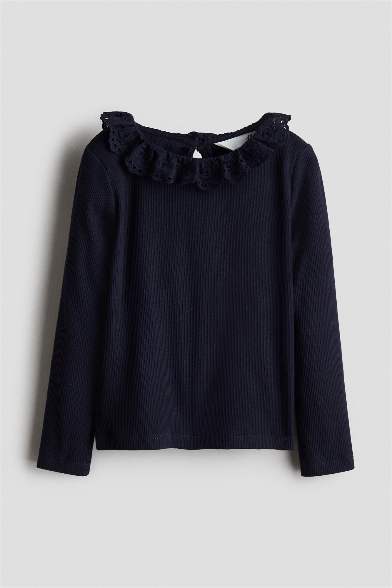 Топ с длинными рукавами из мягкого, ребристого хлопкового джерси с воротником "жабо" из тканого материала, украшенного рисунком broderie anglaise. Круглый вырез и отверстие для ключа с пуговицей сзади.