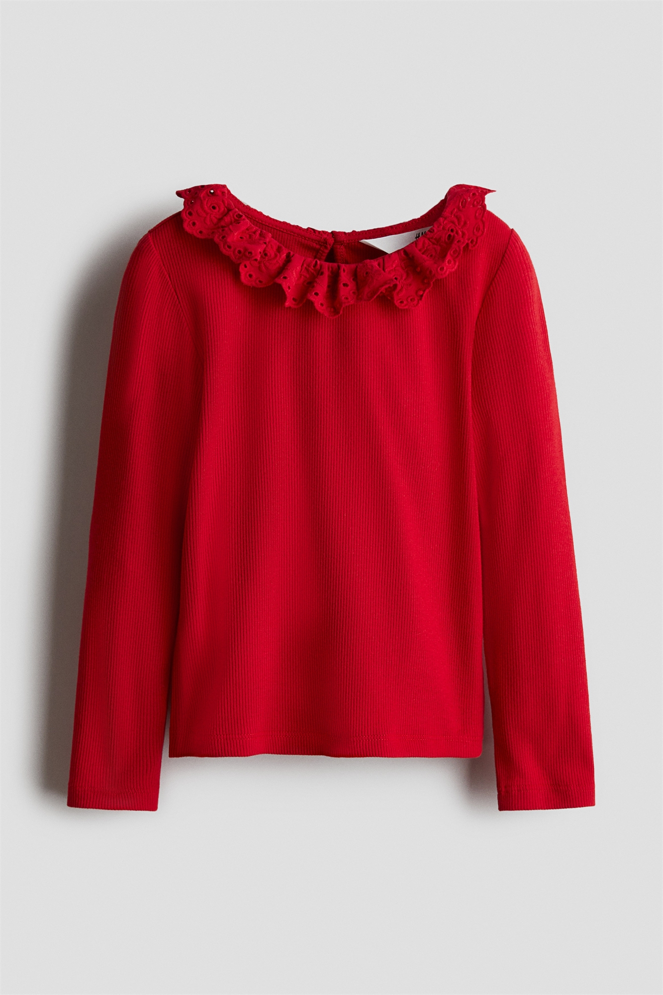 Топ с длинными рукавами из мягкого, ребристого хлопкового джерси с воротником "жабо" из тканого материала, украшенного рисунком broderie anglaise. Круглый вырез и отверстие для ключа с пуговицей сзади.