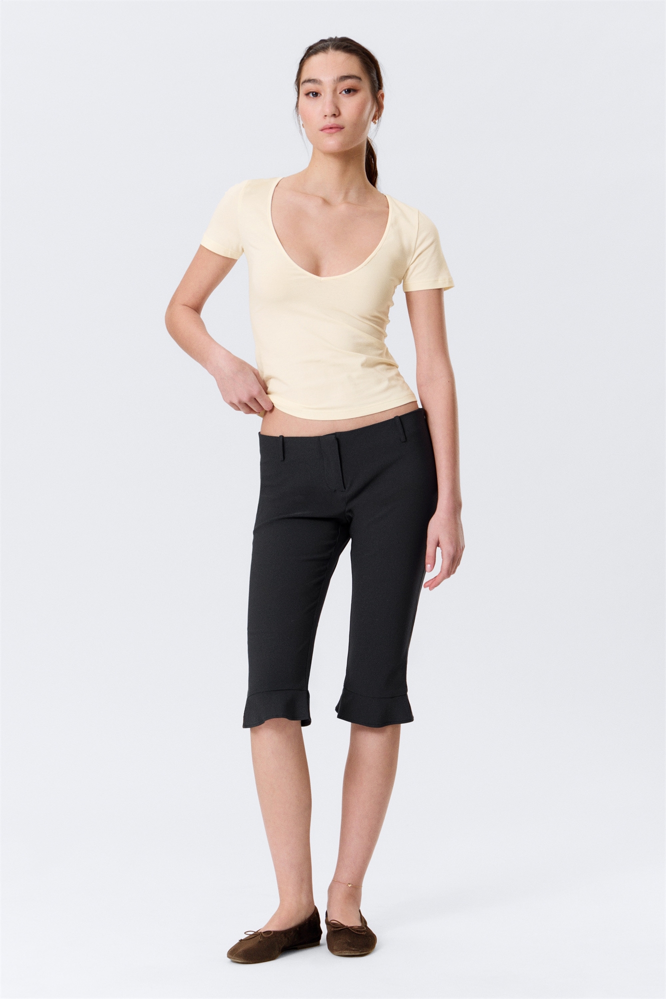 Брюки-капри с низкой посадкой, сшитые из тканого костюмного полотна. Модель с зауженным силуэтом, длиной чуть ниже колена, шлевками для ремня и потайной застежкой-молнией с крючком и петелькой. Низ брюк слегка расклешен.