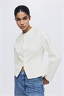 Однобортный блейзер из ткани скуба с круглым вырезом, пуговицами до талии и расклешенным кроем от талии до подола. Спущенные плечи и длинные рукава.