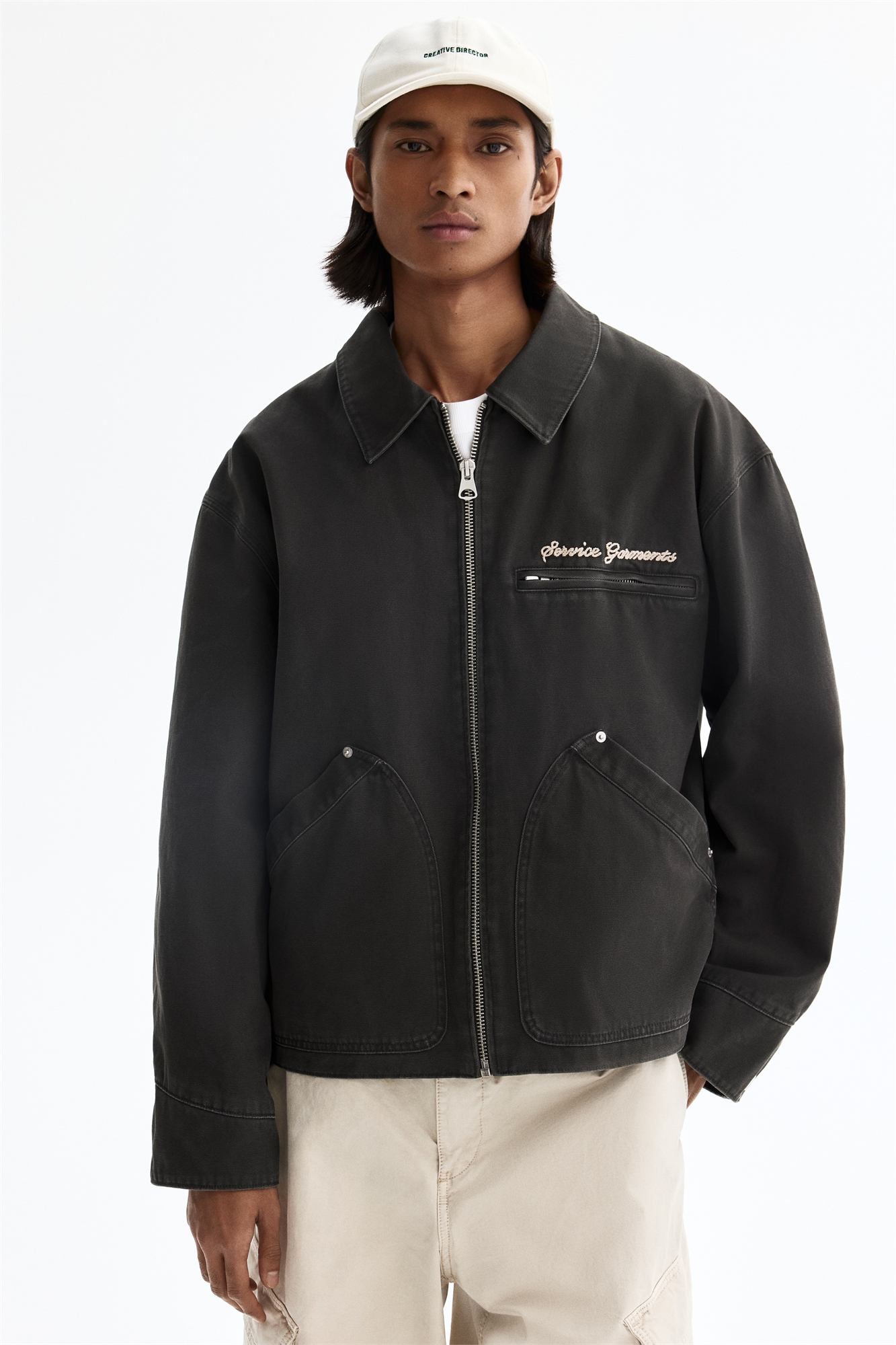 Практичная куртка из прочного хлопкового полотна с воротником, застежкой-молнией спереди, нагрудным карманом на молнии и открытыми накладными карманами спереди. Длинные рукава с кнопками и декоративными заклепками на манжетах. На подкладке.
