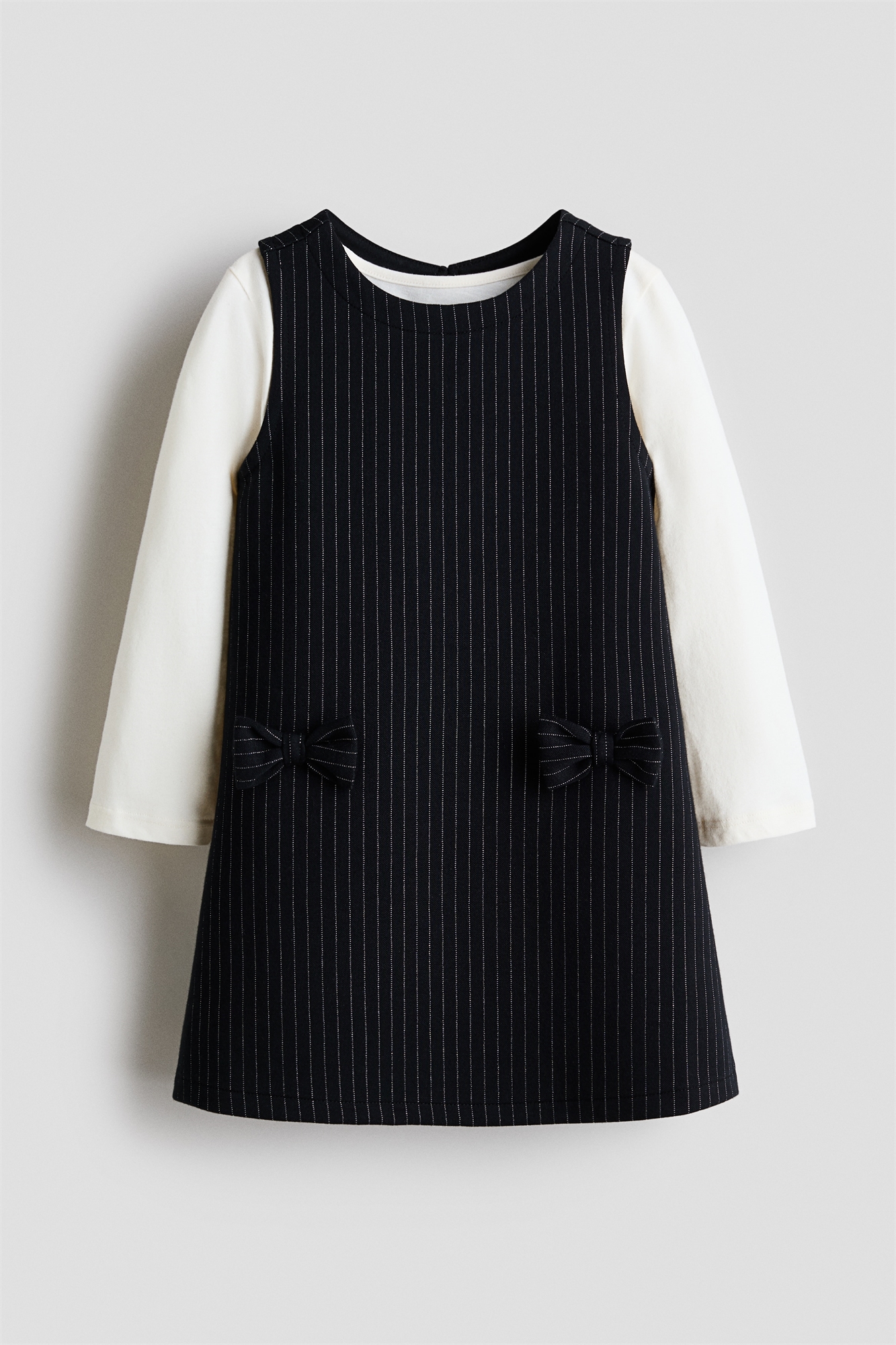 Комплект из платья-сарафана из жаккардового трикотажа в полоску и топа из мягкого хлопкового трикотажа. Топ с круглым вырезом и длинными рукавами. Платье с круглым вырезом и отверстием для ключа с пуговицей сзади. Декоративные банты спереди.