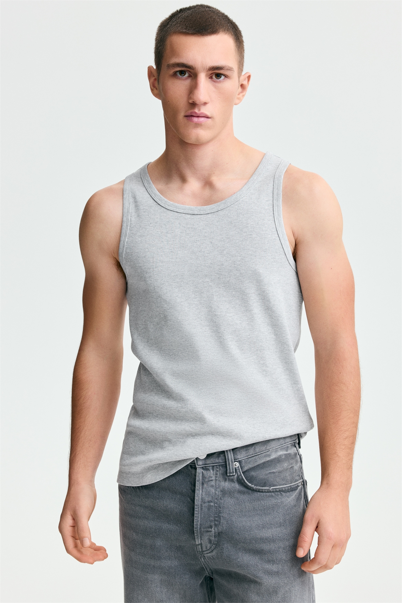 Жилет-топ из легкого ребристого трикотажа из смеси хлопка с прямым кроем подола. Зауженный крой, облегающий контуры тела и создающий приталенный силуэт.