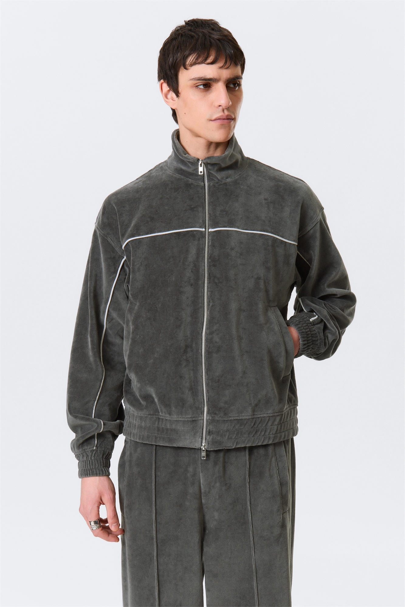 Свободная спортивная куртка из мягкого велюра. Модель с высоким воротником, двусторонней застежкой-молнией спереди и косыми карманами. Спереди и сзади отделана контрастной тесьмой, а манжеты и подол на резинке придают спортивный вид.