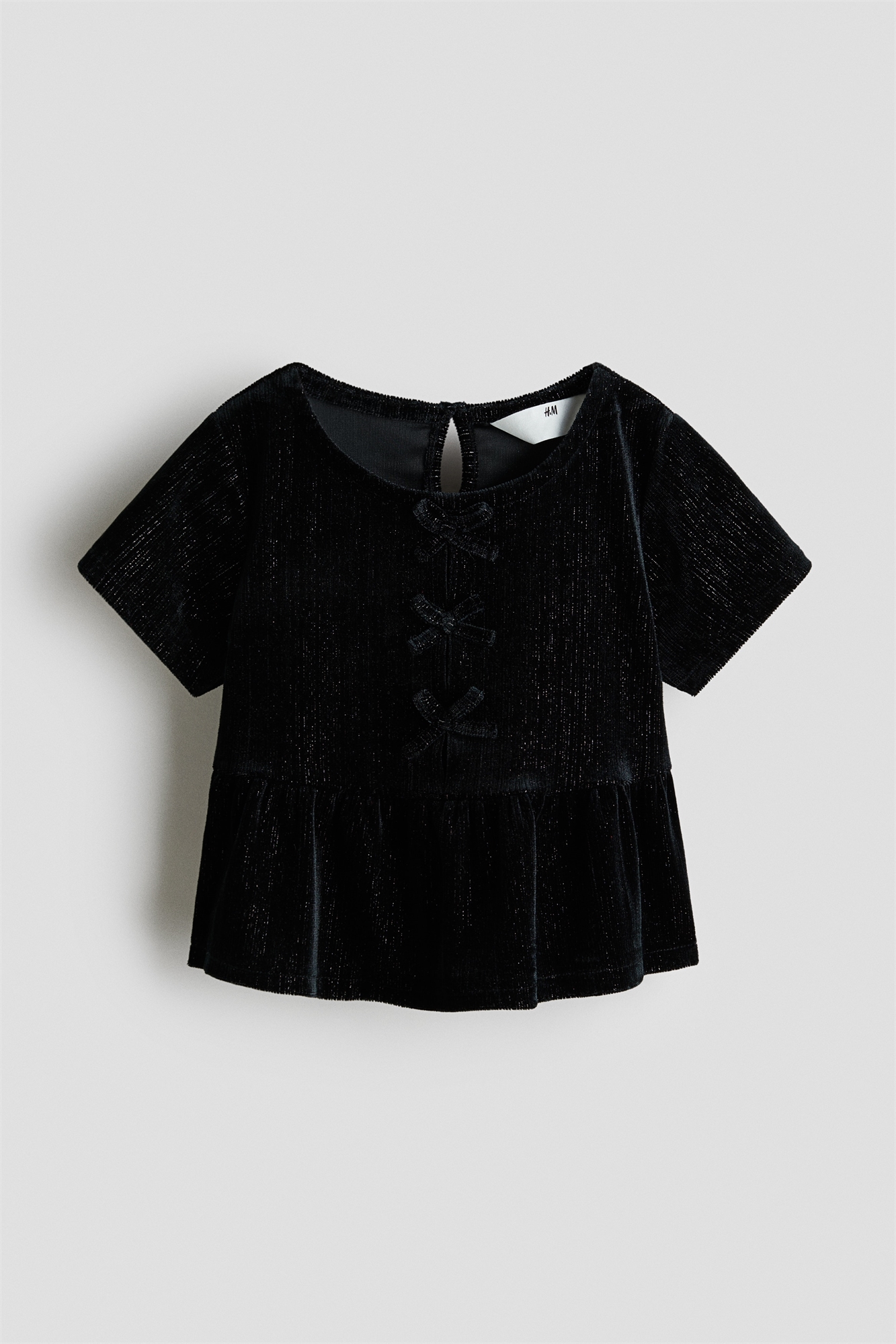 Топ с короткими рукавами из мягкого велюра. Круглый вырез, перевернутая складка спереди, украшенная маленькими бантиками. Застежка на пуговицу сзади, сборки на талии и пеплум.