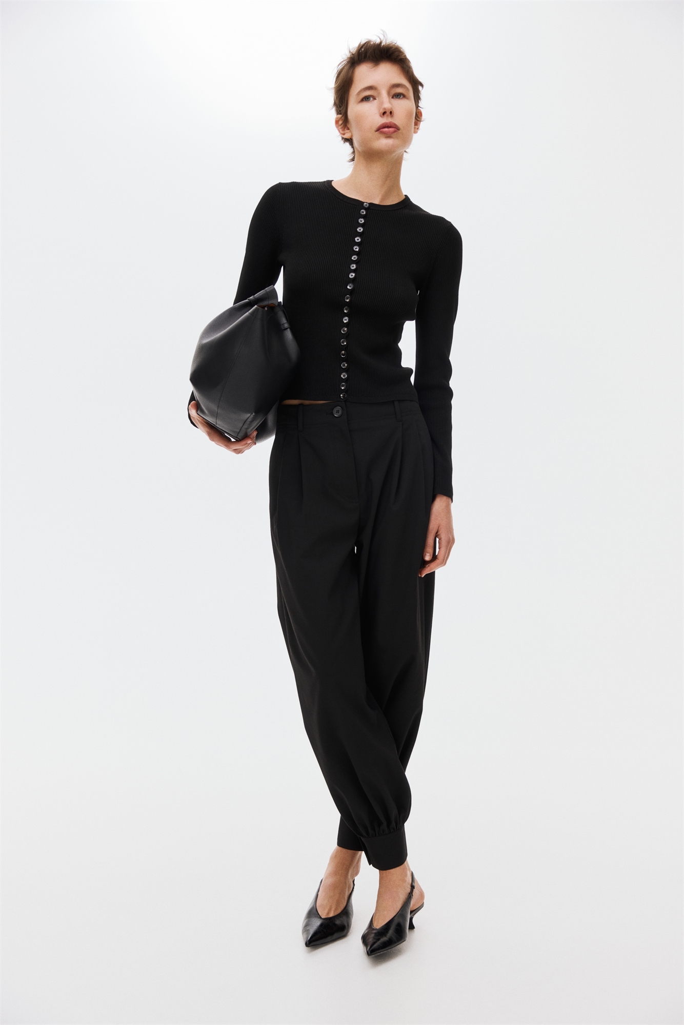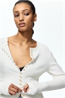Короткий приталенный кардиган из мягкого ребристого трикотажа с круглым вырезом, отделанным ребрами, и гребешковой планкой на пуговицах спереди. Длинные рукава и узкая ребристая отделка на манжетах и подоле.