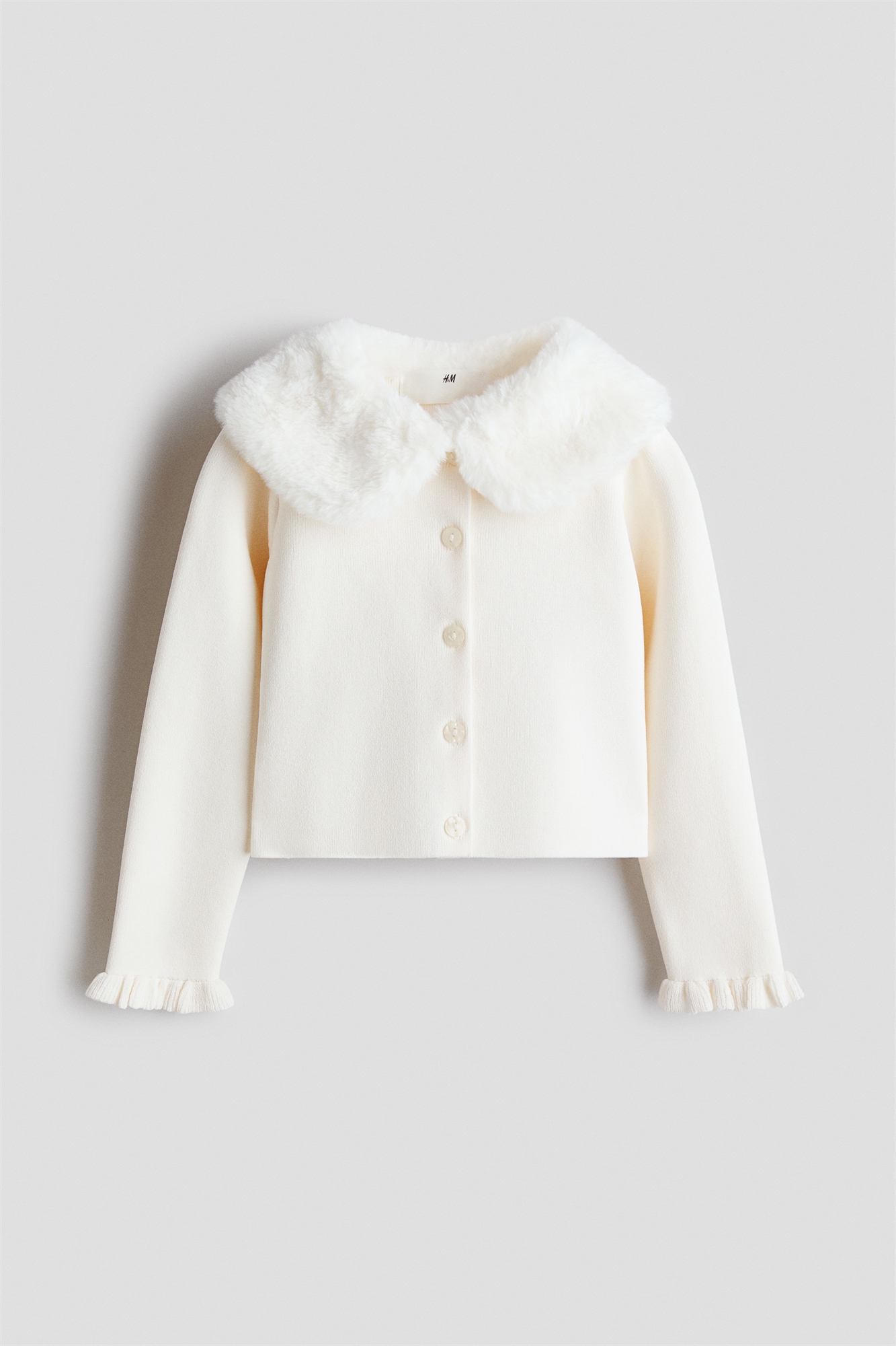 Кардиган из мягкого тонкого трикотажа с пушистым закругленным воротником. Пуговицы спереди и оборчатые манжеты.