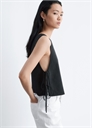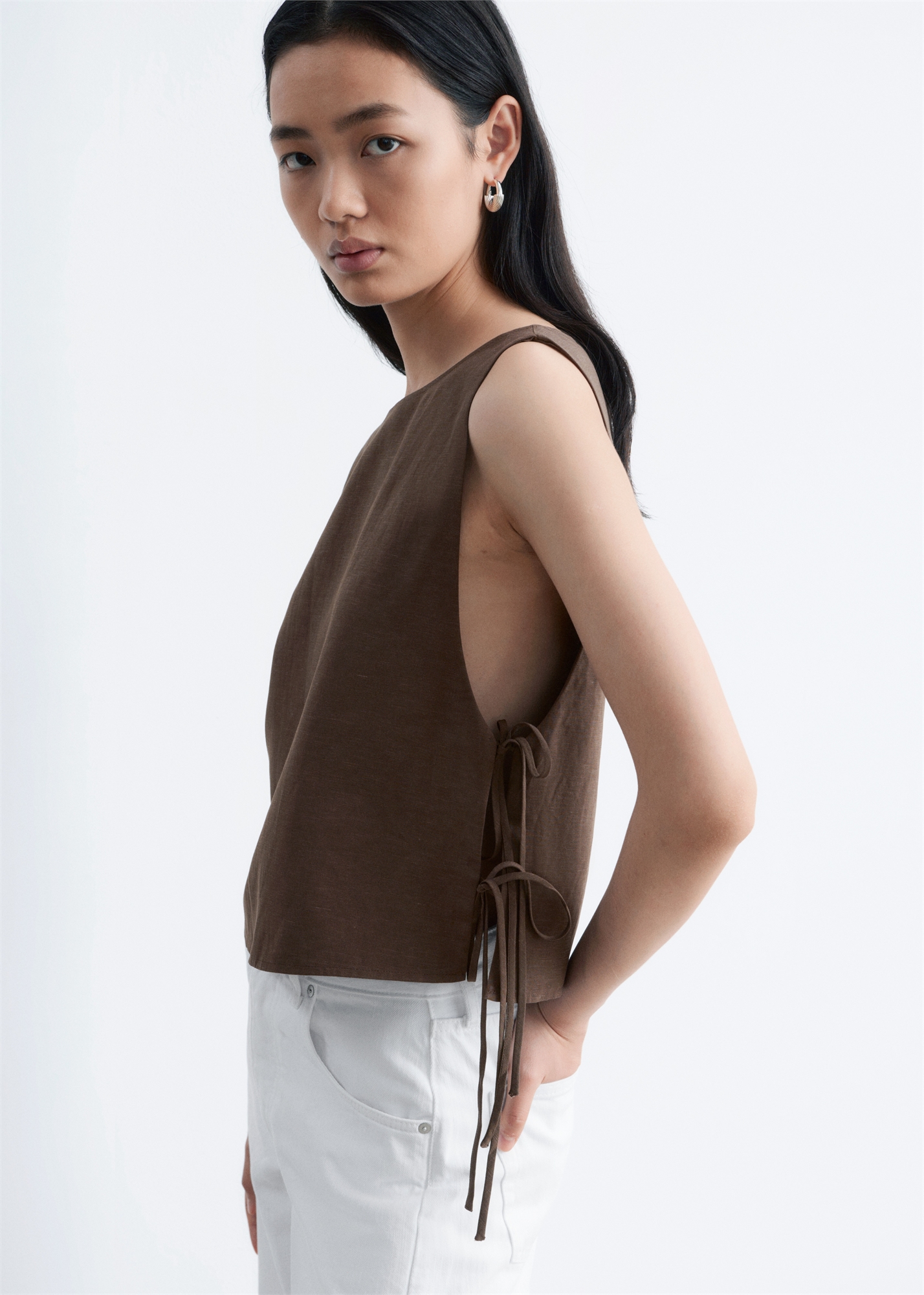 Эта рубашка с воротником-нагрудником, созданная для повседневного ношения в комплекте с другими вещами, выполнена из смесовой ткани с долей льна и имеет прямой крой, круглый вырез и открытые боковые части, завязывающиеся на завязки.