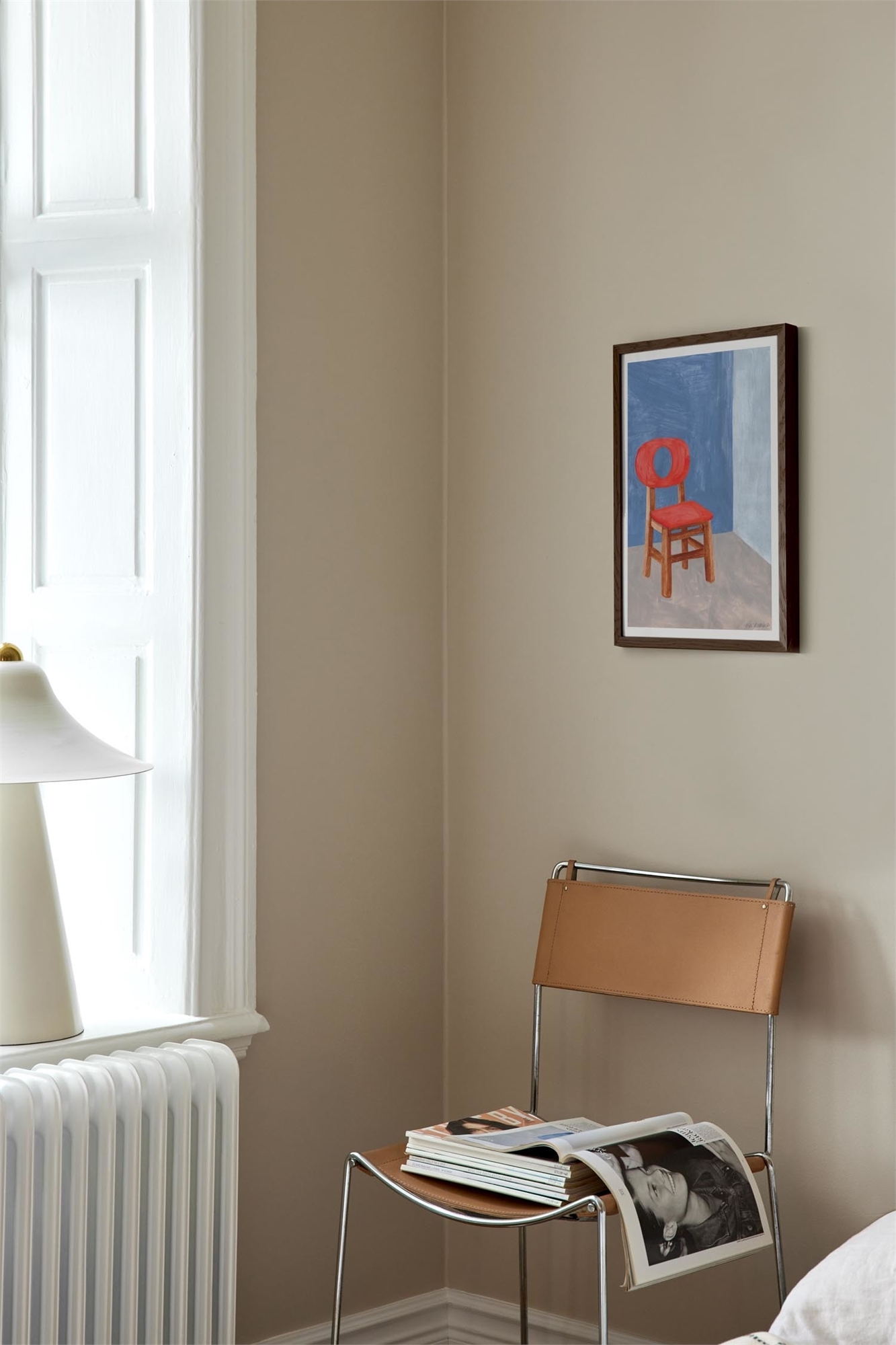 Созерцательная сцена в интерьере, где одинокая фигура сидит за столом, рядом чашка и ваза. Насыщенные красные и пыльные розовые цвета контрастируют с прохладным синим цветом художественной работы в рамке на стене, создавая спокойный, но вызывающий момент.