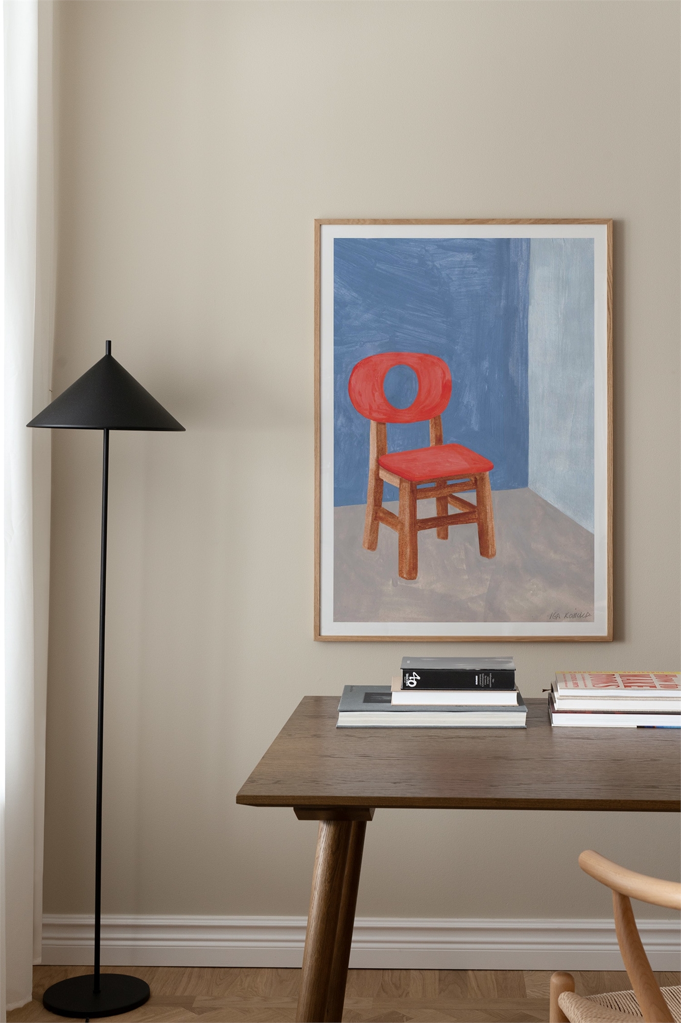 Простая, но яркая интерьерная сцена с деревянным стулом, залитым холодным голубым светом. Контраст между геометрическими формами и органическими текстурами придает картине спокойную - почти сюрреалистическую - атмосферу.
