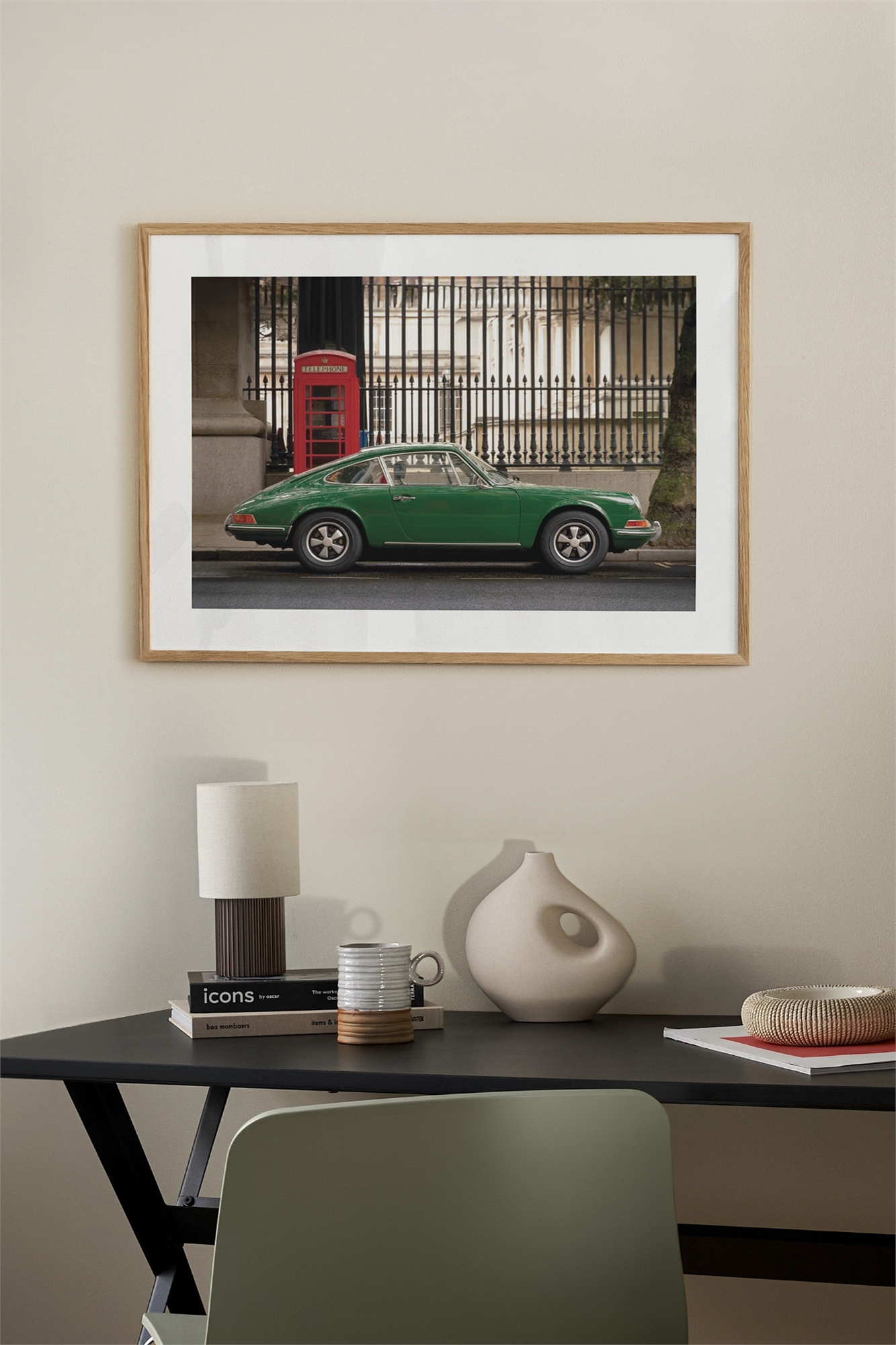 Винтажный Porsche, припаркованный на одной из лондонских улиц, - классический немецкий символ на фоне ярко-красной британской телефонной будки. Обрамление белой рамкой придает спокойной симметрии структуру.
